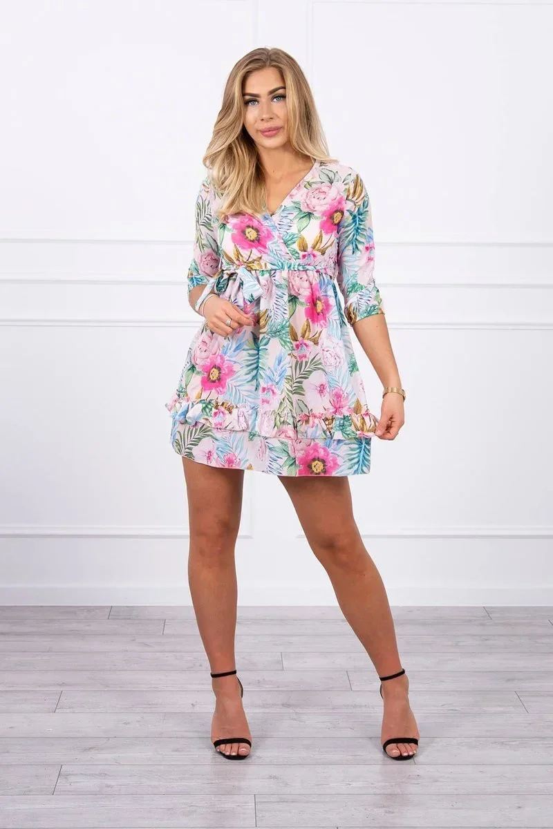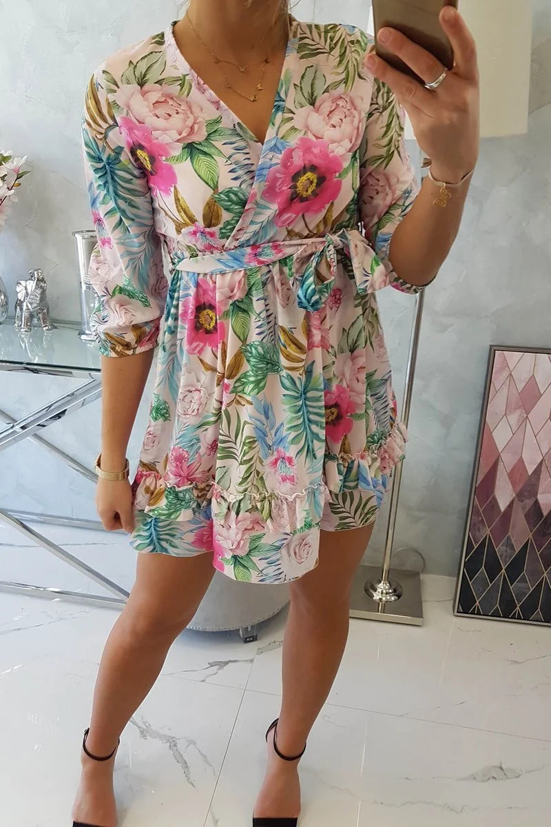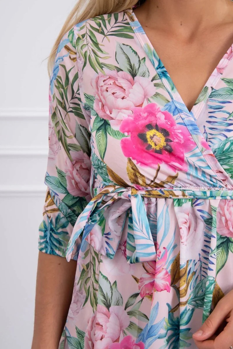 Květinové šaty s vázáním v model 18746781 pudrově růžové - K-Fashion