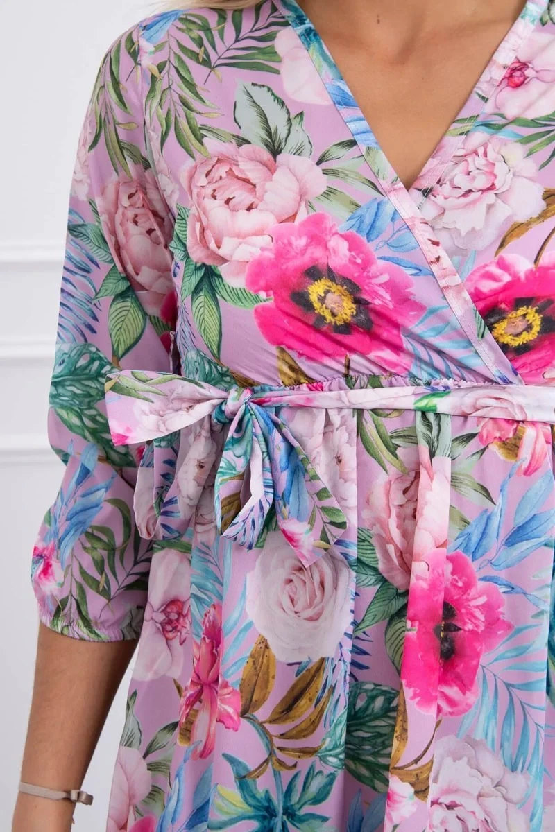 Květinové šaty s vázáním v pase ve fialové barvě