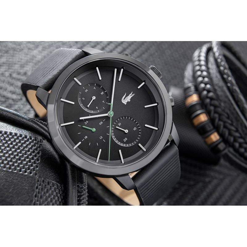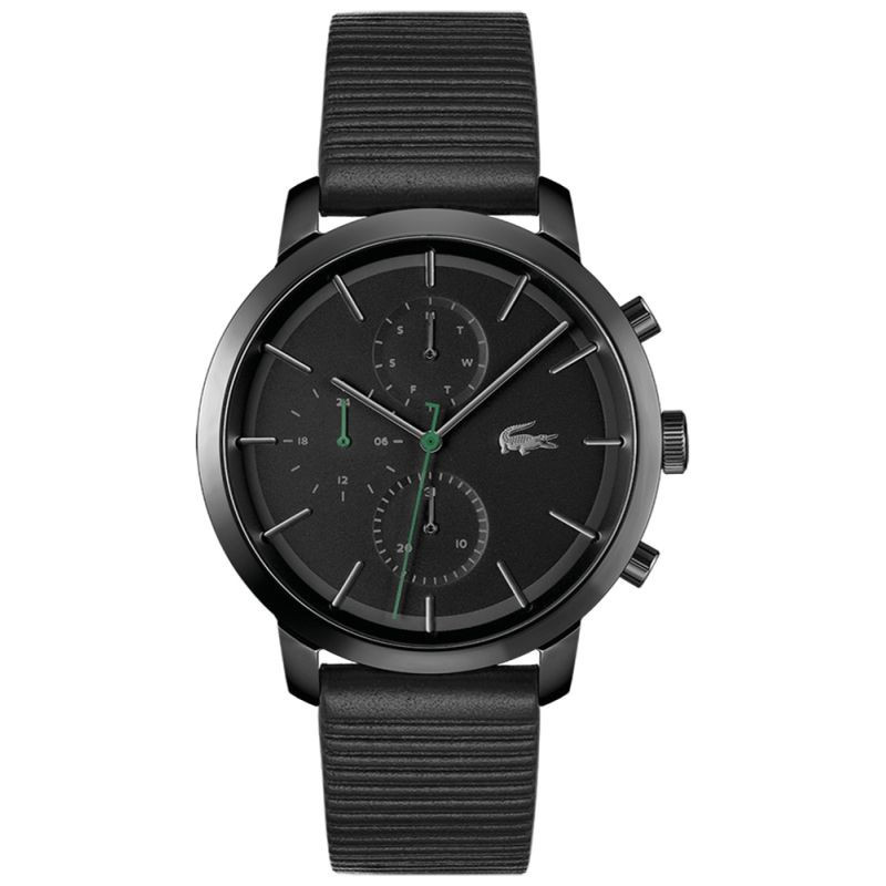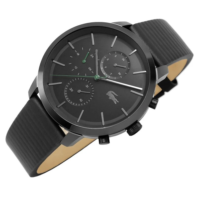 Celkový design je vyveden v sytě matné černé barvě, která působí ostře a mohutně. hodinky se vyznačují jemnými zelenými akcenty na ručičkách, které jim dodávají nádech dynamiky a odkazují na klasické logo Lacoste. hodinky jsou vyrobeny z robustních materiálů a mají pouzdro z nerezové oceli, které zajišťuje odolnost a elegantní vzhled. černý texturovaný řemínek z přírodní kůže dokonale ladí se sportovním a zároveň stylovým charakterem tohoto modelu a zajišťuje celodenní pohodlí. černé logo Lacoste hrdě vyvedené na ciferníku a sponě je známkou prestiže, která asociuje nadčasovou kvalitu.