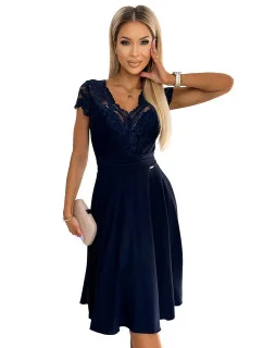 Elegantní dámské šaty s krajkou a krátkými rukávy. Barva je tmavě zelená. Vzor krajky se může lišit od obrázku.