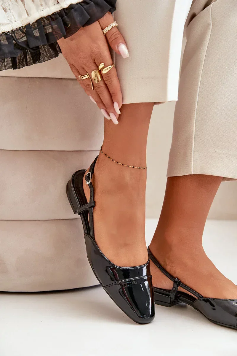 Lakované baleríny na nízkém podpatku, s otevřenou patou, jsou stylovým doplňkem každého šatníku.