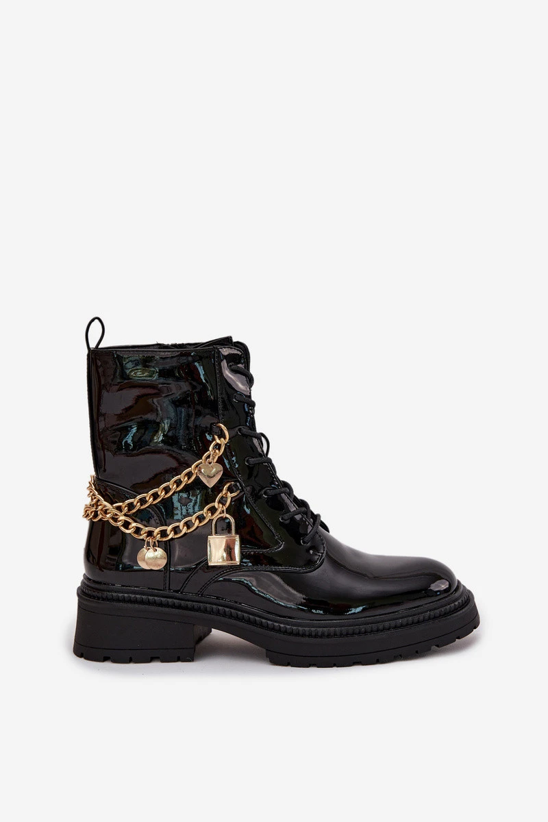 Lakované Botky Worker Damské Se Zlatým Řetízkem Zateplené Černé Sarinae
