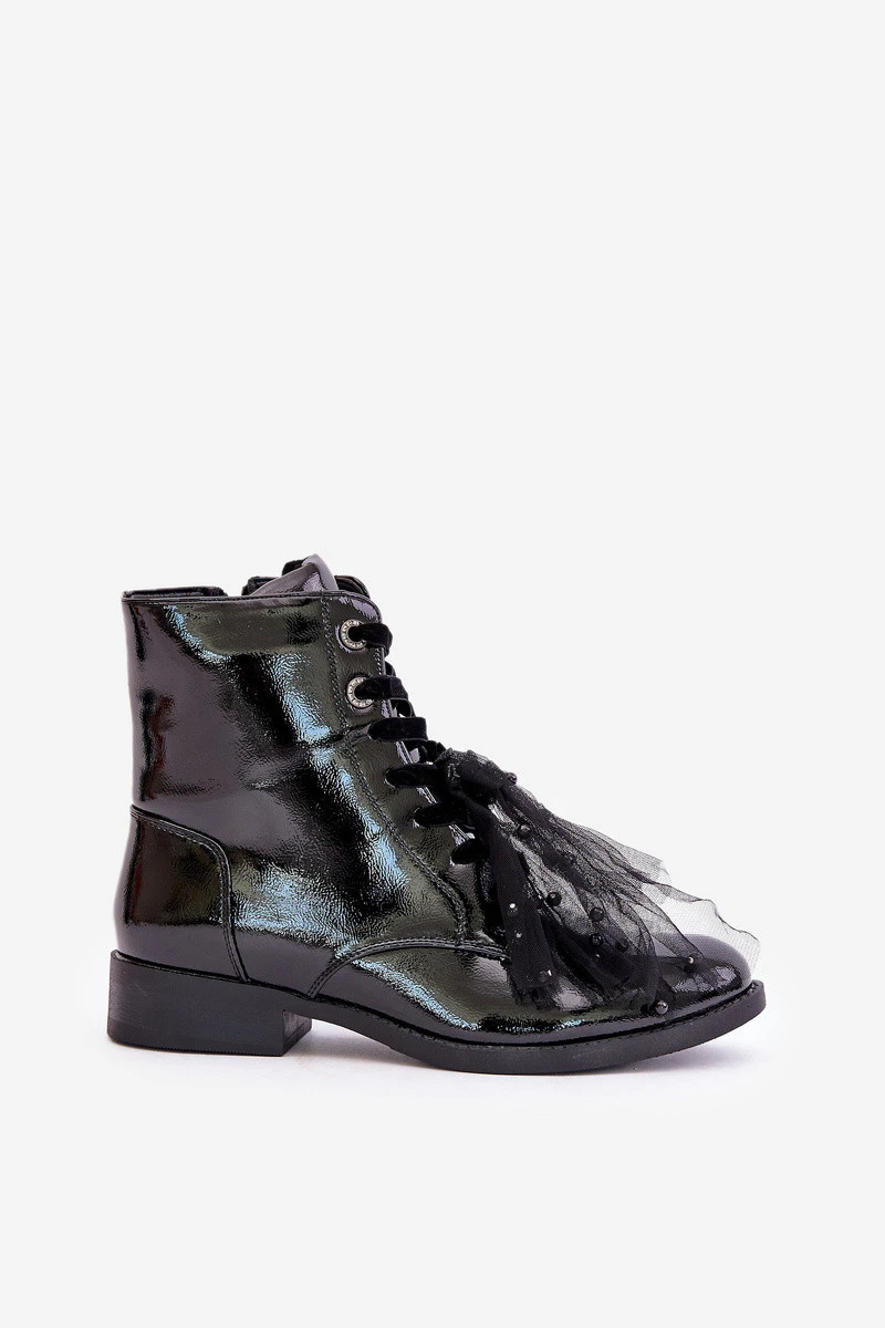 Lakované boty vyrobené z eko kůže jsou módní a elegantní volbou na chladnější dny. Model je umístěn na plochém podpatku, což zajišťuje pohodlí při nošení, a zateplení zaručuje teplo. Zapínání na zip usnadňuje obouvání, zatímco ozdoba na šněrování dodává výjimečný půvab. Ideální pro každodenní i elegantnější stylizace. Při výběru velikosti se řiďte tabulkou velikostí.