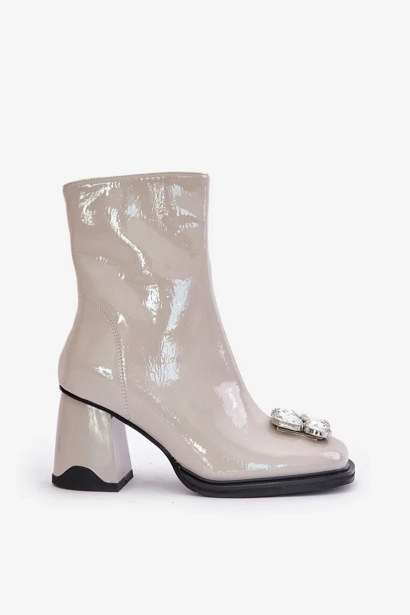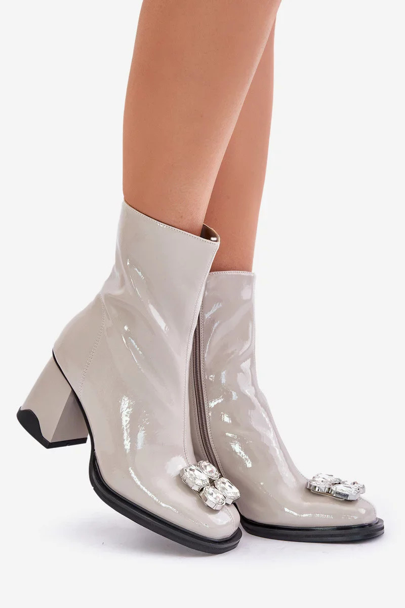 Lakované Dámské Kotníkové Boty Na Podpatku S Ozdobou D&A Světle šedé