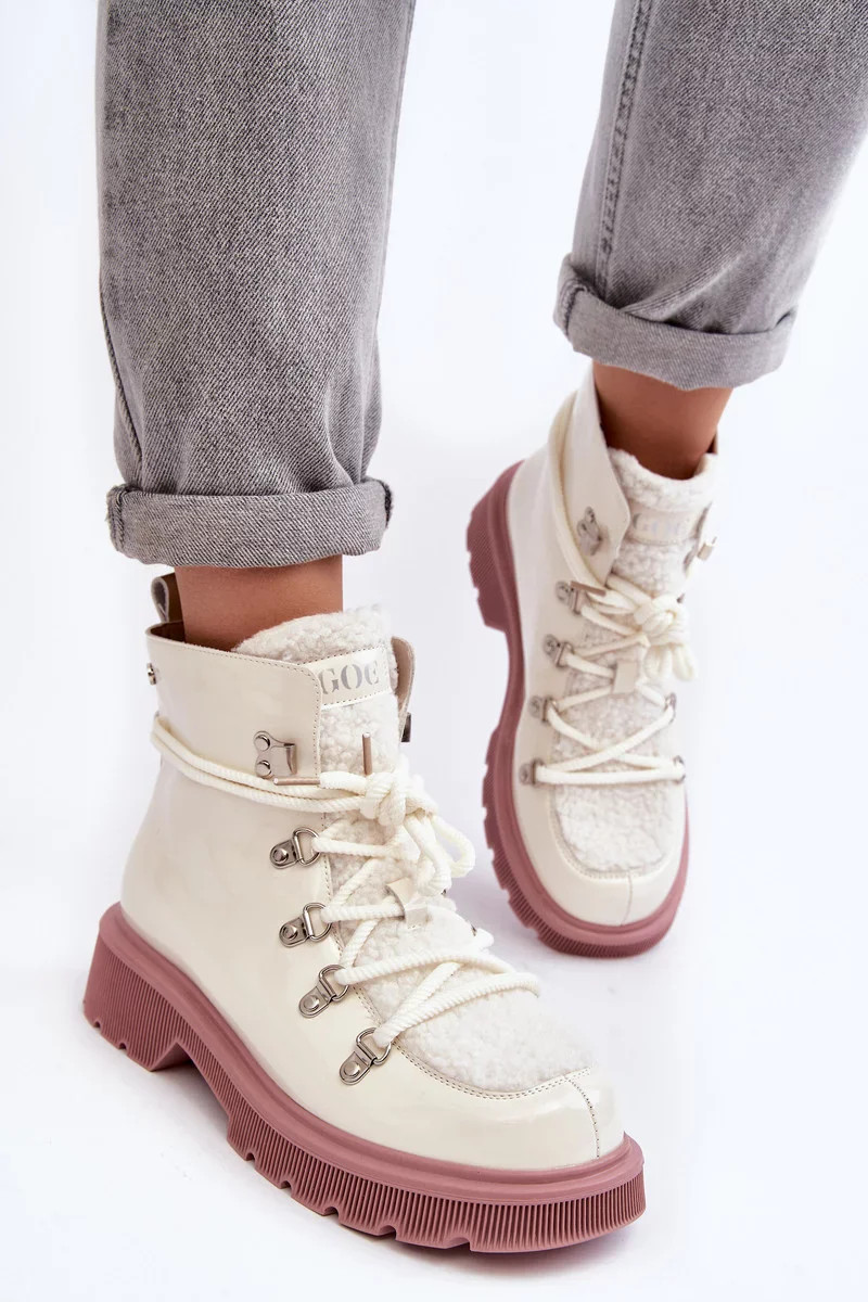 Dámské kotníkové boty značky GOE. Vyrobeno z přírodní kůže. Nasazené na plochém podpatku. Model na šněrování. Přední stranu zdobí kabátek z ovčí kůže. Zaoblené prsty. Vyztužená pata. Uvnitř zateplené dekou na boty. Klasický model, který využijete k mnoha podzimním i zimním stylizacím! Při výběru velikosti se prosím řiďte tabulkou velikostí