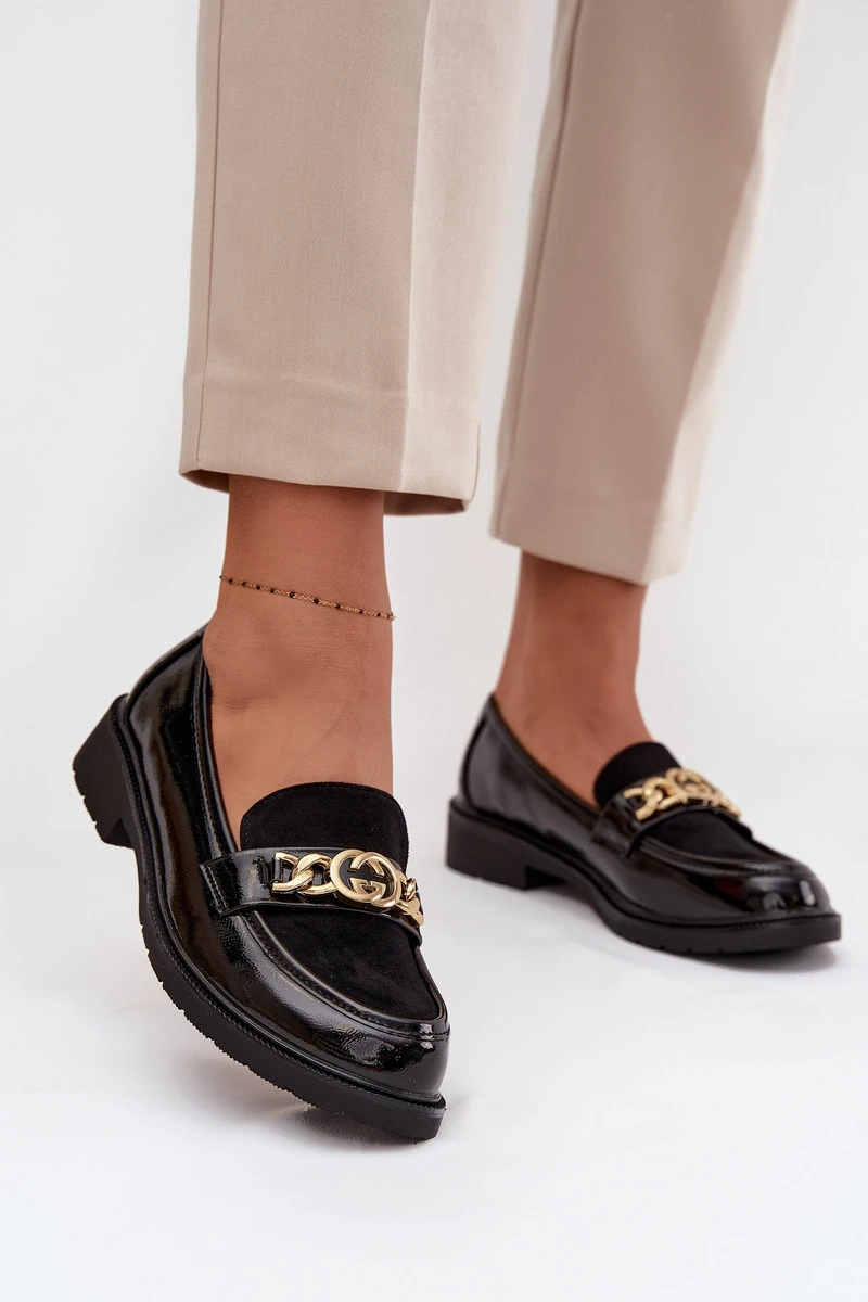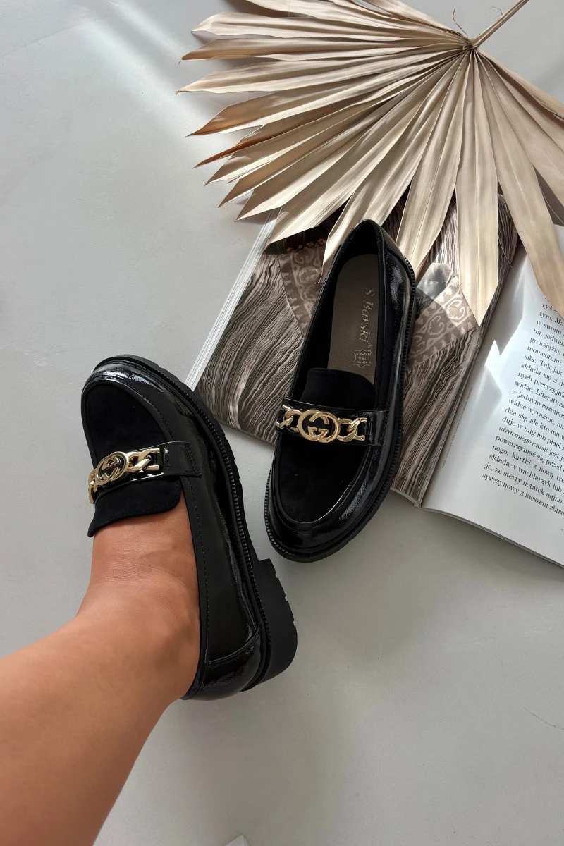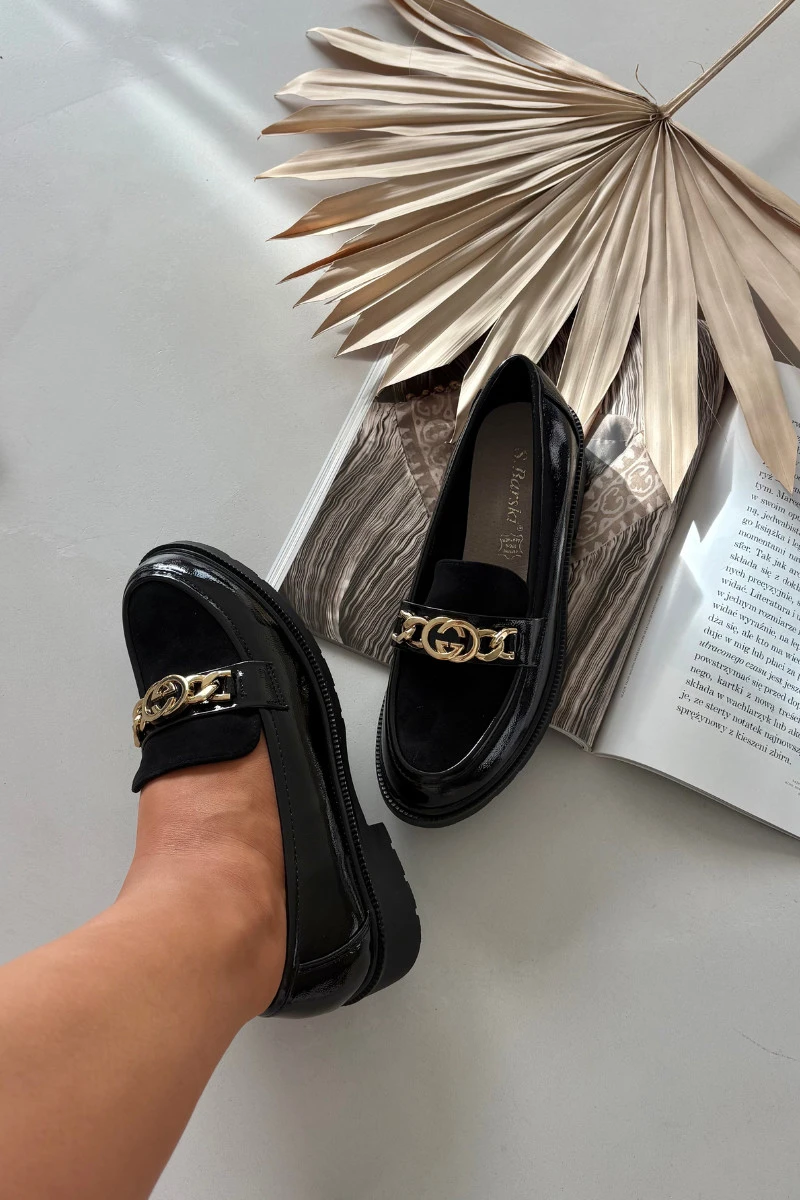 • Lakované dámské mokasíny se zlatou ozdobou S.Barski – černé