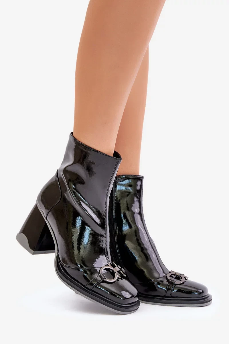 Dámské kotníkové boty vyrobené z lakované eko kůže jsou stylovou volbou na chladnější dny. Zabudované na stabilním podpatku typu sloupek, dodávají postavě eleganci a moderní vzhled. Model má čtvercové špičky a ozdoba vpředu zdůrazňuje módní charakter. Zateplené obuvnickou podšívkou, poskytují pohodlí a teplo, a zapínání na zip usnadňuje rychlé obouvání. Ideální pro elegantní a vycházkové stylizace. Při výběru velikosti se prosím řiďte tabulkou velikostí.