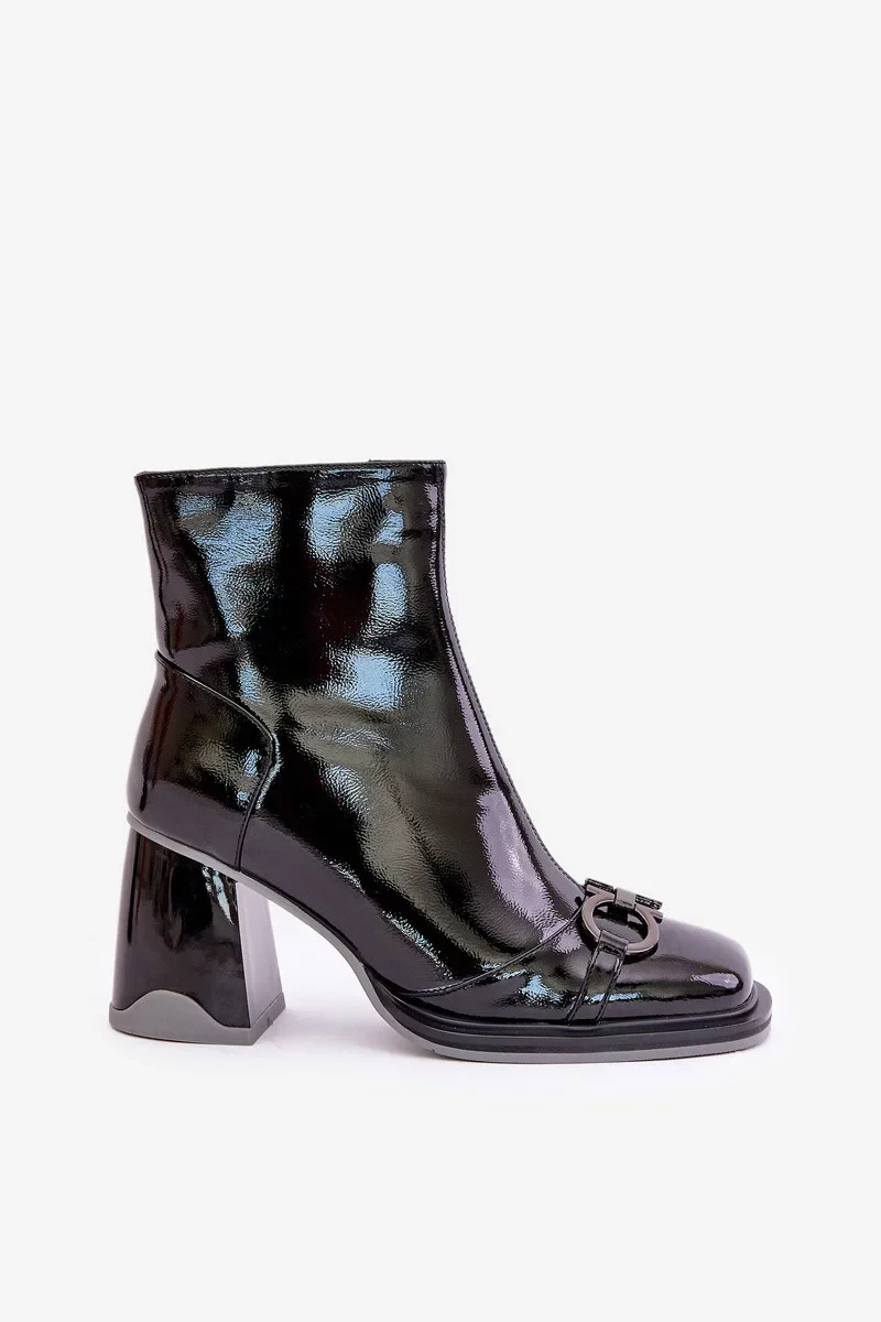 Lakované kotníkové boty na podpatku zateplené s ozdobou D&A černé