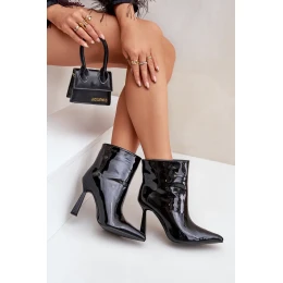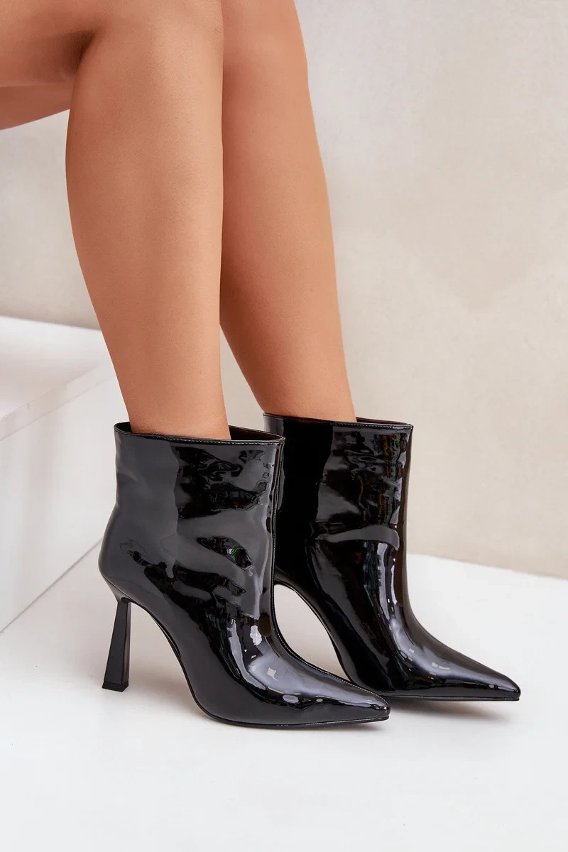 Lakované dámské kotníkové boty na vysokém podpatku. Model s špičatými nosy, který opticky zeštíhluje nohu. Zateplené obuvnickou podšívkou, dokonale se osvědčí v chladnějších dnech. Ideální pro styling na speciální příležitosti. Při výběru velikosti se prosím řiďte tabulkou velikostí.