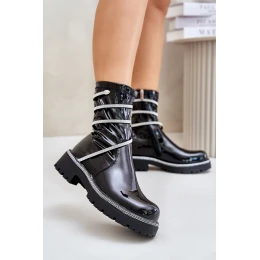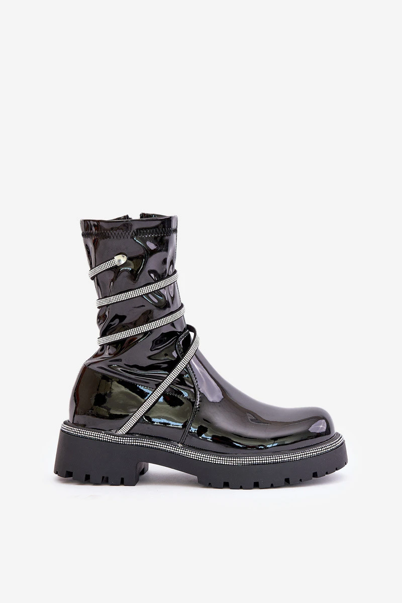 Lakované kotníkové boty vyrobené z eko kůže jsou elegantním návrhem na každý den. Model posazený na plochém podpatku zajišťuje pohodlí a zaoblené špičky jim dodávají klasický vzhled. Zapínání na zip usnadňuje obouvání a zdobení malými zirkony dodává výjimečný lesk. Oteplené pouze v oblasti chodidla poskytují komfort a lehkost při nošení. Při výběru velikosti se řiďte tabulkou velikostí.