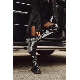 Dámské kozačky vyrobené z lakované eko kůže. Uloženy na masivní platformě s plochým podpatkem, zajišťují stabilitu a pohodlí. Zaoblené špičky dodávají jemnost, a model s dodatečným zipem na dolní části svršku usnadňuje obouvání. Guma na vrchu svršku dodává charakter, a zateplení obuvnickým rounem pouze na úrovni chodidla zaručuje teplo a komfort. Ideální na chladnější dny, tyto kozačky skvěle doplní zimní stylizace s šaty a sukněmi. Při výběru velikosti prosíme řídit se tabulkou velikostí. Při výběru velikosti se řiďte tabulkou velikostí.