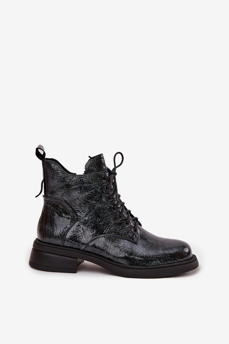 Dámské kotníkové boty vyrobené z přírodní lakované kůže jsou elegantní volbou na chladnější dny. Nízký podpatky ve tvaru kostky zajišťují stabilitu a pohodlí při nošení. Model má šněrování a praktický zip, což usnadňuje oblékání a dokonalé přizpůsobení noze. Vnitřek je vyplněn obuvní vlnou, která zaručuje tepelný komfort, takže boty jsou ideální na podzimní a zimní sezónu. Jedná se o univerzální obuv, která skvěle doplní jak každodenní, tak i formálnější stylizace. Při výběru velikosti se řiďte tabulkou velikostí. Při výběru velikosti se řiďte tabulkou velikostí.