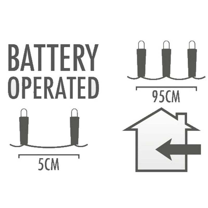 Lampki zasilane są 3 bateriami AA 1,5 V, dzięki czemu udekorujesz każdą powierzchnię, również taką, gdzie nie ma dostępu do stałego źródła prądu.