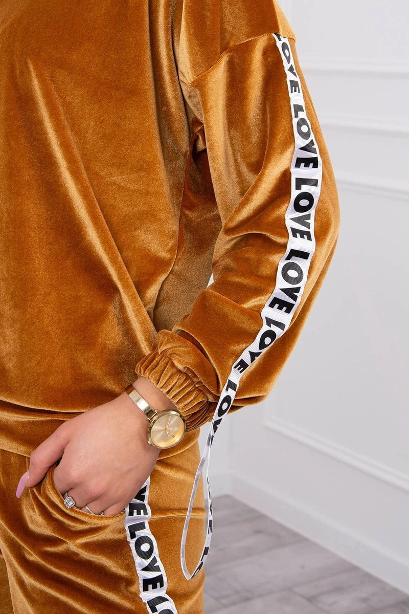 Představujeme vám sadu mikiny a kalhot. Sada z veluru. Mikina má stuhy s nápisem Love. Kalhoty s kapsami a zavazováním v pase. Velmi módní a stylová sada. Sada je vyrobena z vysoce kvalitního materiálu. Velikost je univerzální a vyhovuje dámám velikosti S, M nebo L.