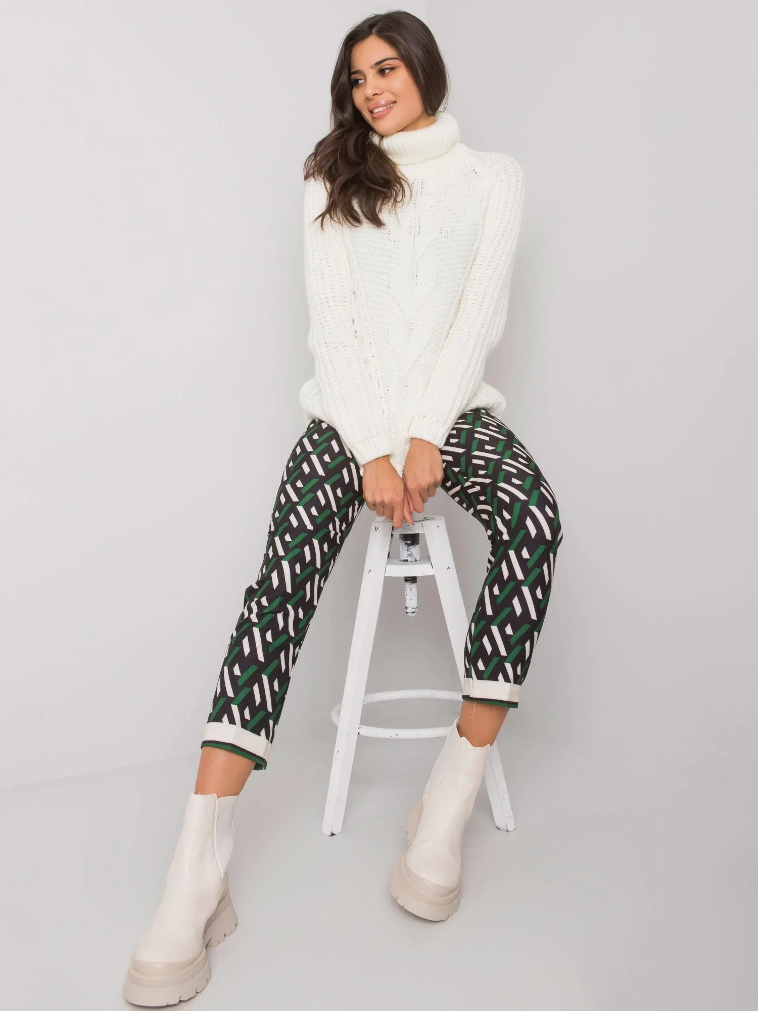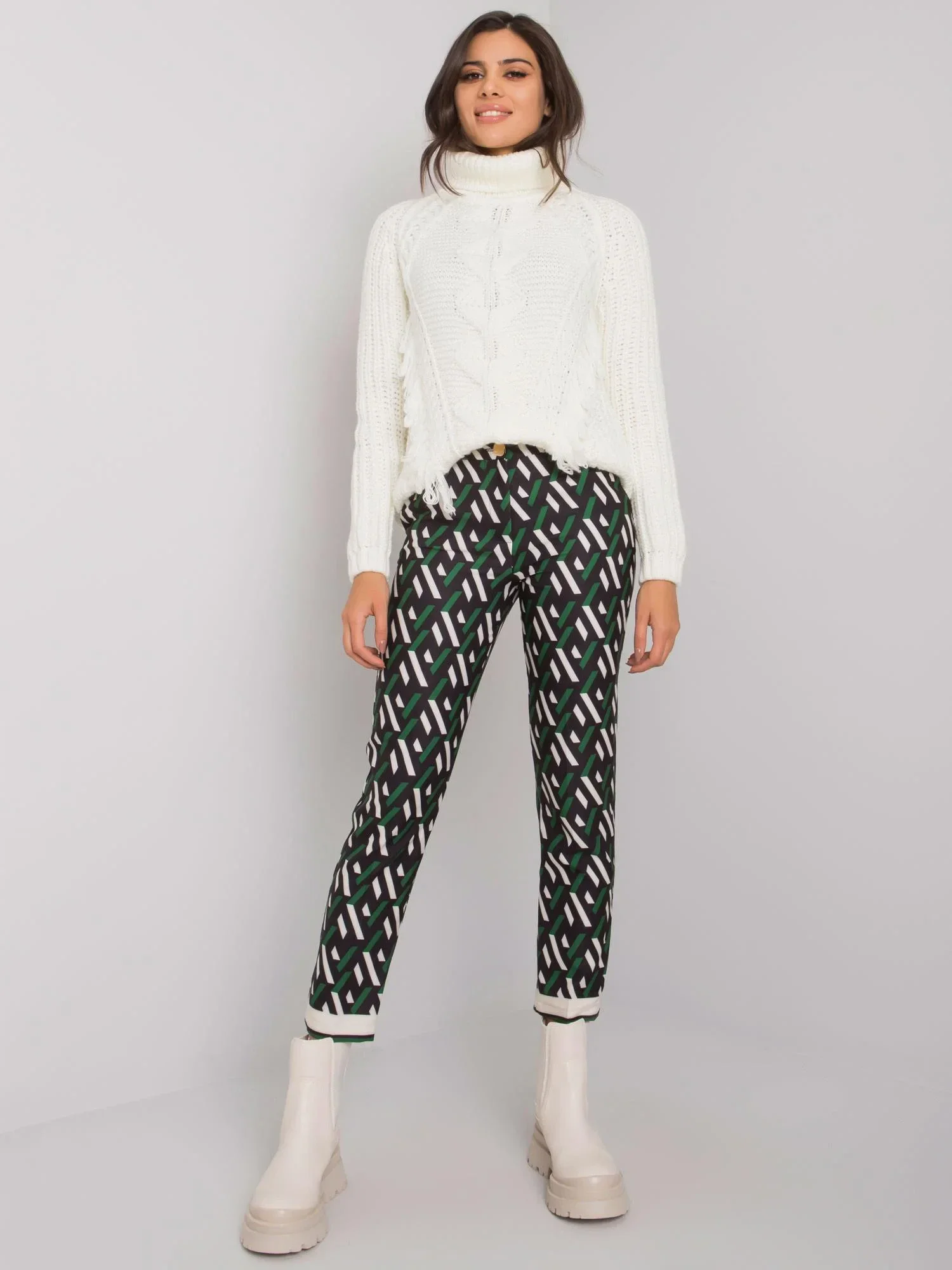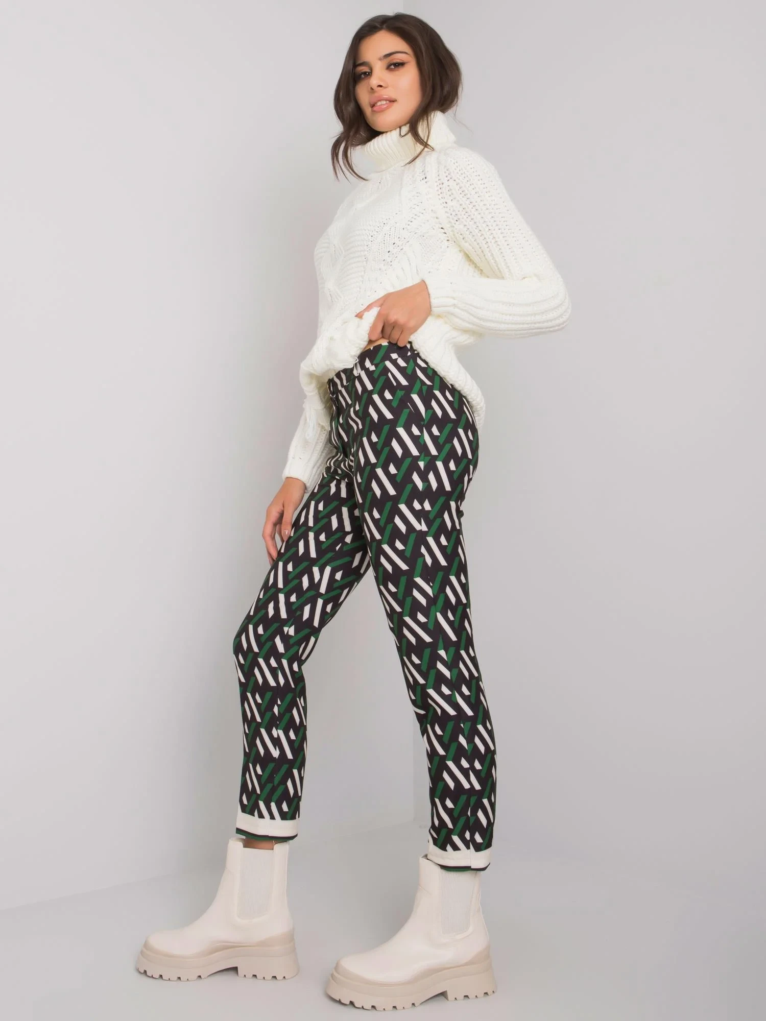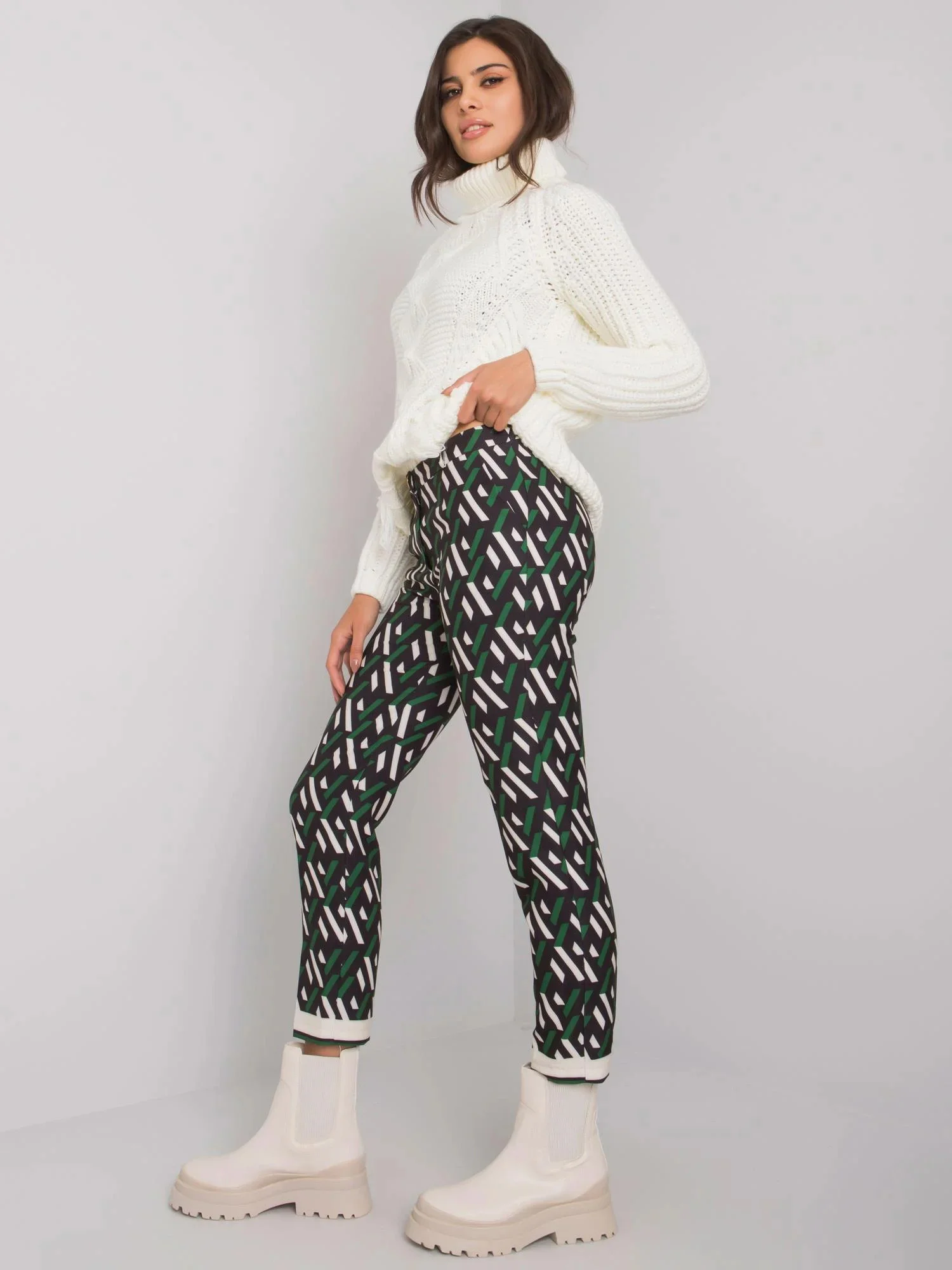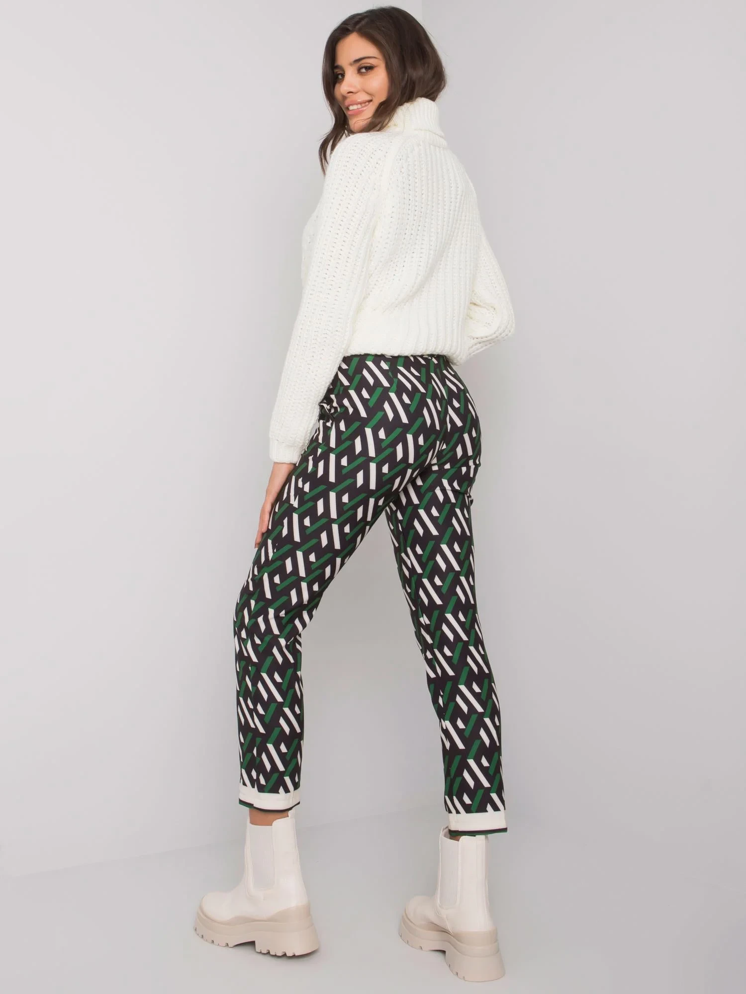 Kalhoty z černé a zelené vzorované látky.