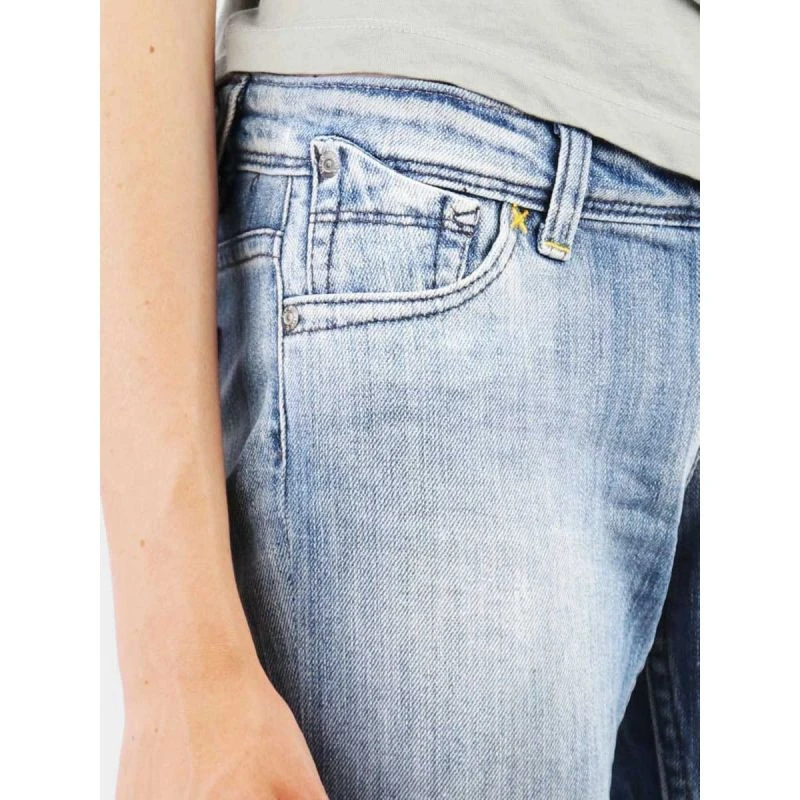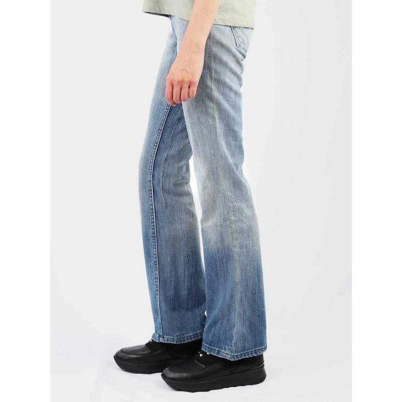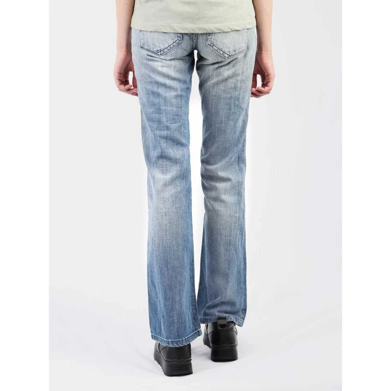 Dámské džínové kalhoty s nízkým sedem, rozšířenými nohavicemi, poklopcem na zip a koženou nášivkou s logem na zadním pásu