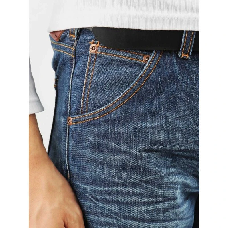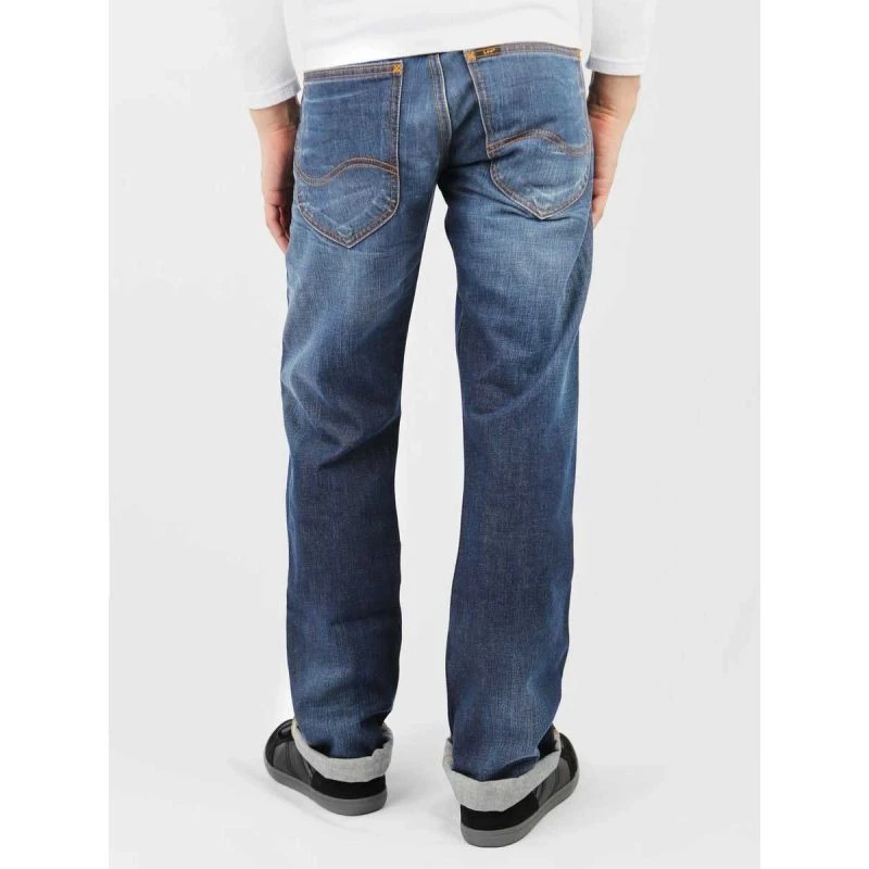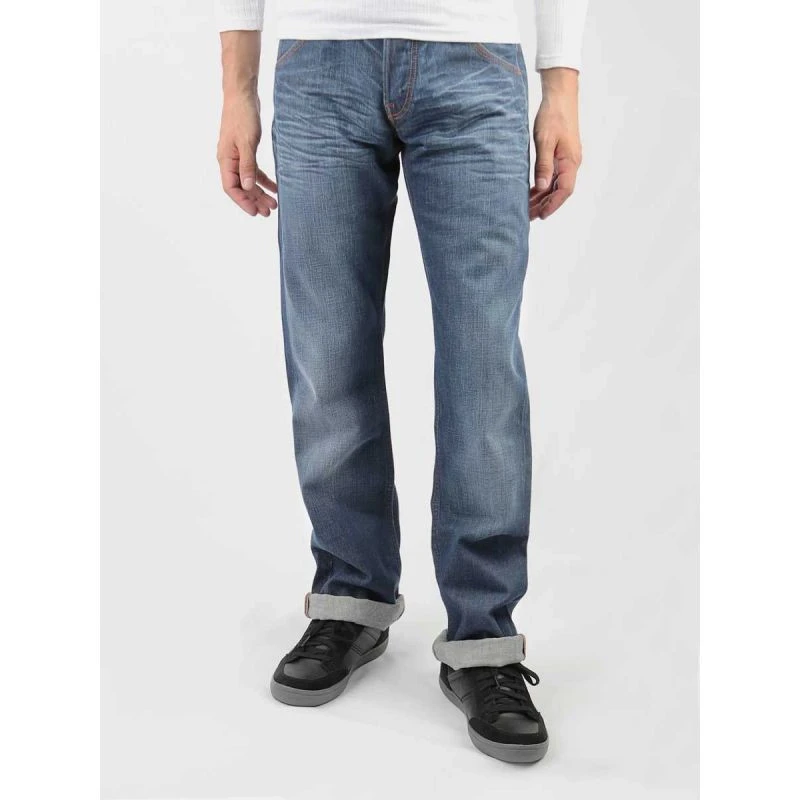 Pánské džínové kalhoty s nízkým sedem, rovnými nohavicemi, zapínáním na knoflíky a koženou nášivkou s logem na zadním pásu.