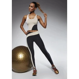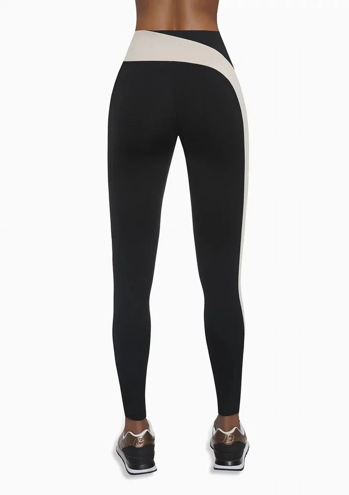 Sportovní legíny z materiálu PLUSH-ZERO (PZ) ARCHROMA. Tento materiál má funkční vlastnosti, a proto je označován jako úchvatný, díky své speciální úpravě struktury chemických vláken má ARCHROMA výrazně zlepšené vlastnosti proudění vzduchu a odstraňování vlhkosti. Sportovní legíny s asymetrickým, všitým, béžovým pruhem krásně podtrhuje postavu.