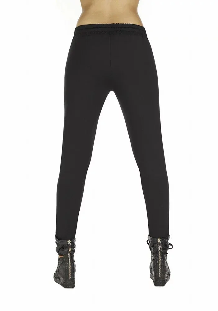 Legíny, které jsou vyrobené z pružné látky, z materiálu Plyš-Velvet. Legíny jsou kryjící a tvarují postavu. Ve vnitřní straně modelu je jemný kožíšek. V pase je pohodlná guma s popruhy. Na úrovni boků a na stehnech jsou zipy imitující kapsičky. Kolena zdobí ozdobná prošití. Nohavice lemují stahovací lemy.