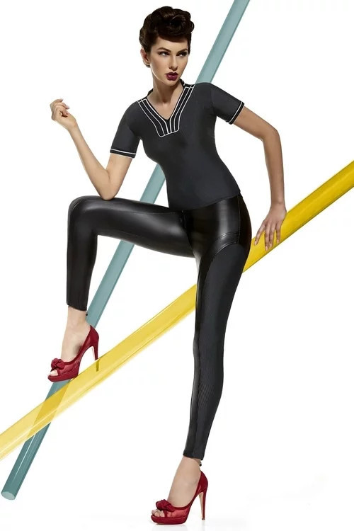 Elegantní dámské leginy Tiffany Bas Bleu jsou vyrobeny z imitace kůže v kombinaci s matným materiálem s jemným proužkem. Tímto spojením vznikl naprosto dokonalý model podtrhující ženskou svůdnost a smyslnost. Vsadka opticky prodlouží nohy. Díky elastičnosti materiálu leginy dokonale přilnou k postavě a zvýrazní Vaše křivky. V pase je zapínání na zip, vzadu guma. Kotníky zdobí funkční rozepínatelné zipy.