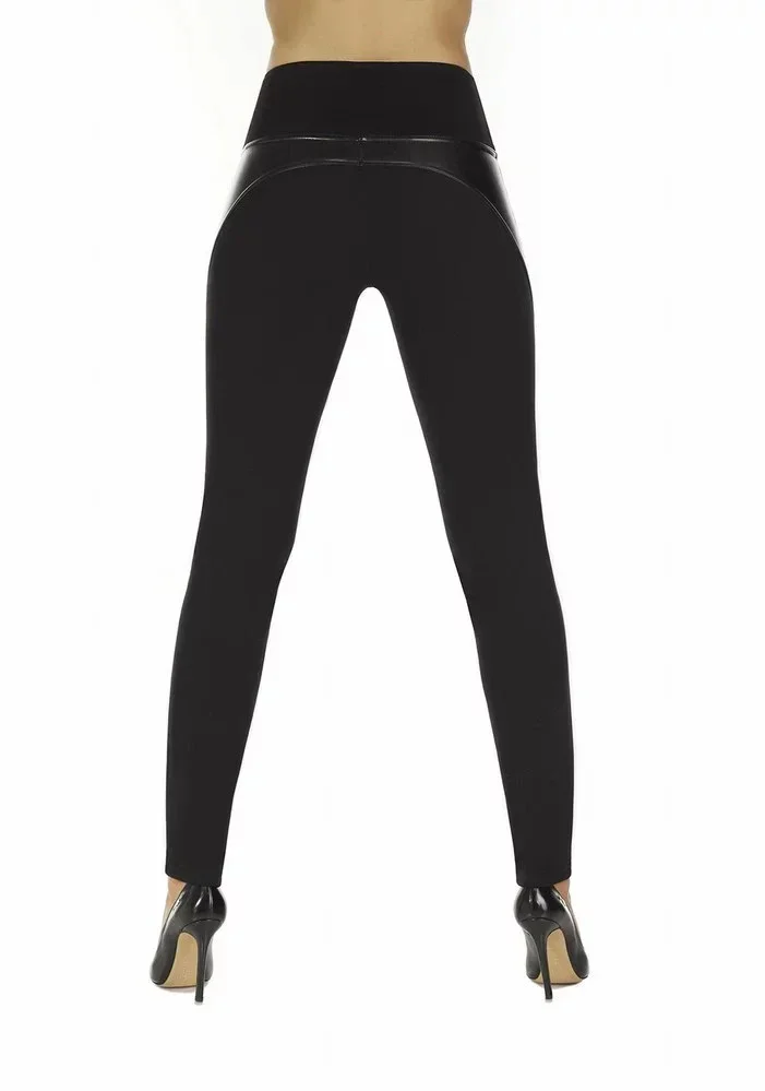 Stylové legíny z elastického materiálu s přídavkem eko-kůže, z materiálu SQUEEZE + ECO LEATHER s efekty push - up pozvedajícím zadeček, pas zpevněný pomocí široké gumy v pase, opticky zeštíhlené nohy.