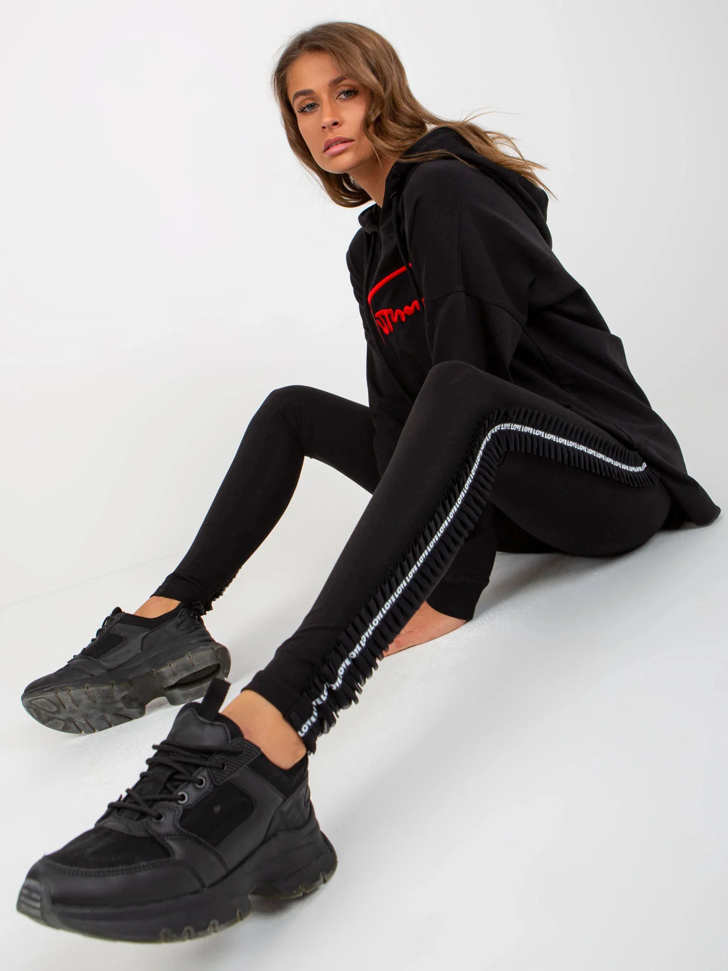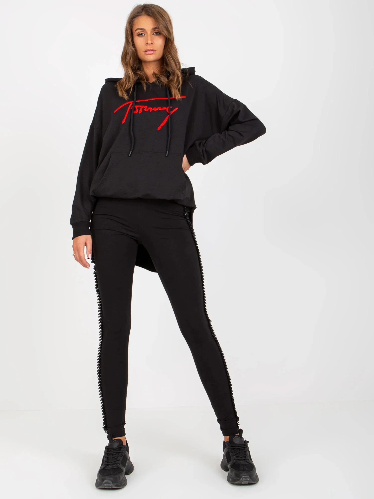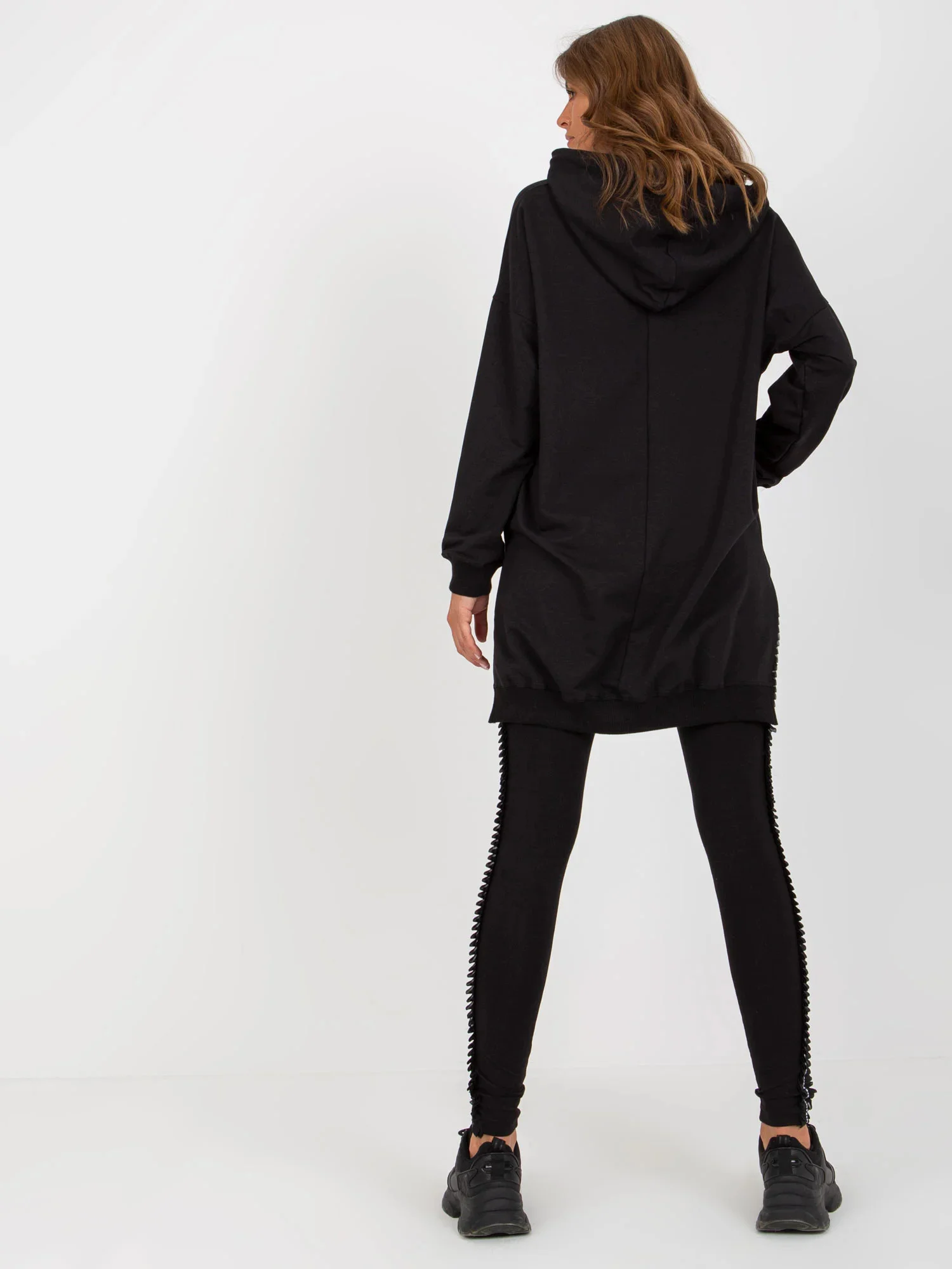Modelka má na sobě velikost M. Rozměry modelky: výška 176 cm, prsa 85 cm, pas 64 cm, boky 92 cm.