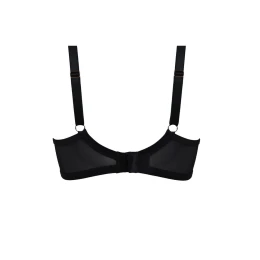 Zachwyć się elegancją i komfortem z miękkim biustonoszem z fiszbinami, zaprojektowanym z myślą o kobietach z większym biustem. Miseczki wykonane z beżowej siateczki, ozdobione intensywną neonową koronką, subtelnie eksponują dekolt dzięki transparentnemu tiulowi wykończonemu czarną lamówką. Ta konstrukcja łączy lekkość z wyjątkową stabilnością — biustonosz idealnie unosi, zbiera i podtrzymuje biust, a szeroka fiszbina precyzyjnie otula całą pierś. Szerokie ramiączka dostosowane do rozmiaru misek zapewniają wygodę i minimalizują nacisk na ramiona, nawet podczas długiego noszenia. Tył wykonany z oddychającej siateczki, bez bocznych fiszbin, gwarantuje wygodę i dopasowanie.