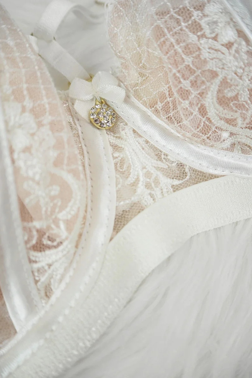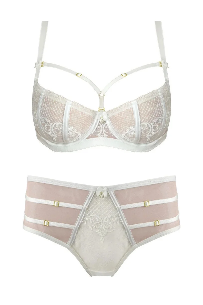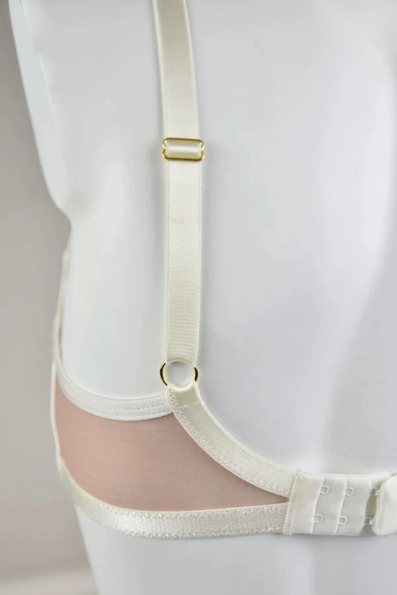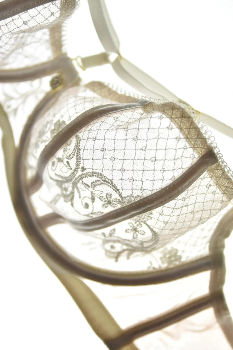 Měkká podprsenka typu balconette, košíčky z béžové síťoviny, na které je našita krémová výšivka s ozdobným gór.