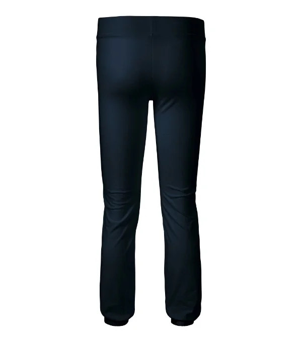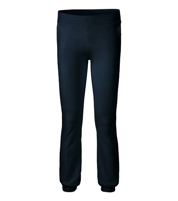 strečový materiál udržující stálost tvaru rovný střih nohavic široký pasový límec s pruženkou klínové kapsy dolní lem stažený pruženkou