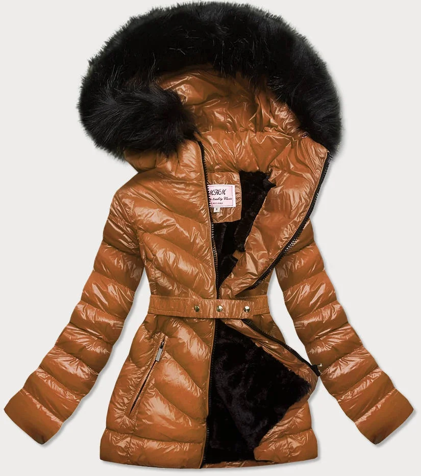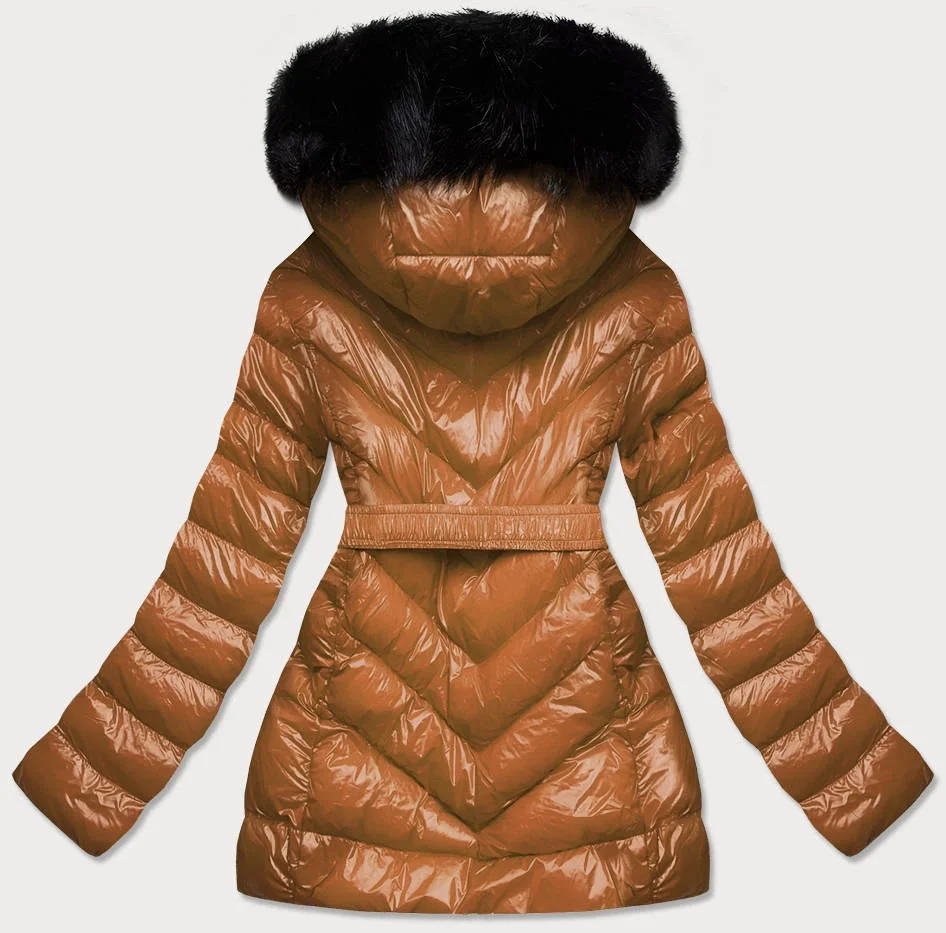 Lesklá zimní bunda v karamelové barvě s mechovitou kožešinovou podšívkou (w673)
