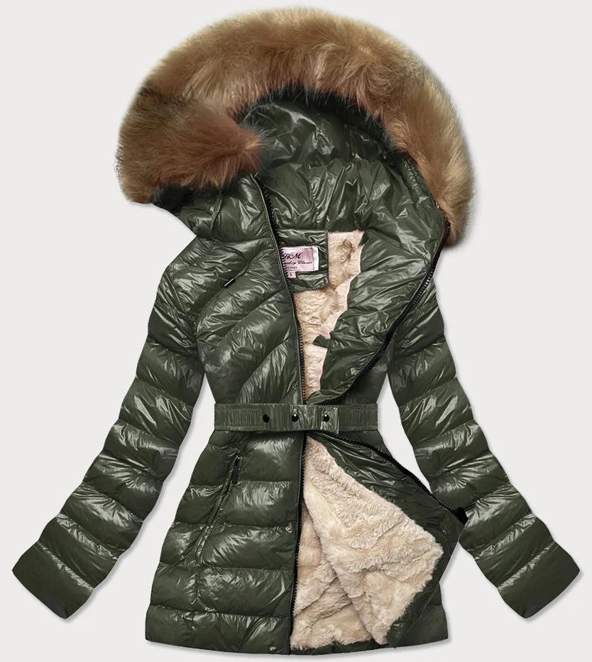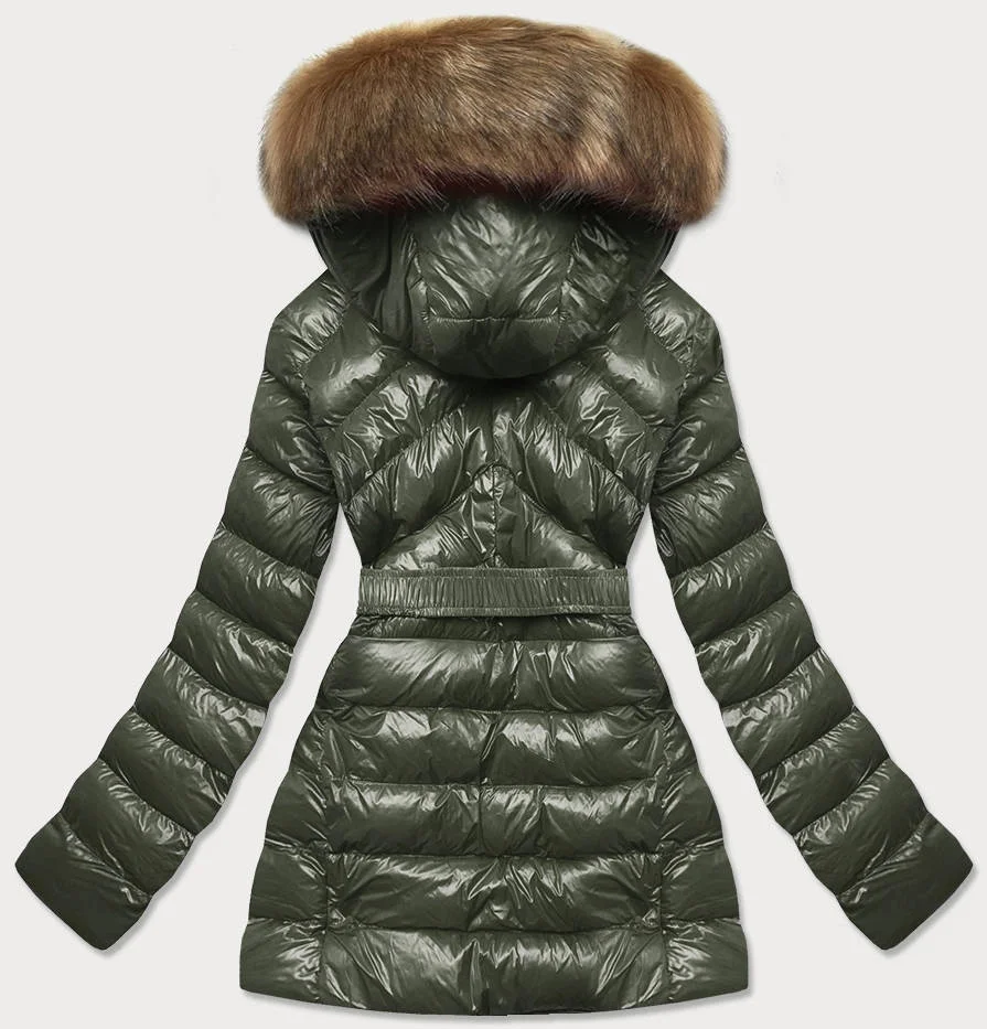 Lesklá zimní bunda v khaki barvě s mechovitou kožešinovou podšívkou (w674)