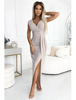 Lesklé béžové dámské šaty s krátkými rukávy, výstřihem a rozparkem na noze model 20101940 - numoco