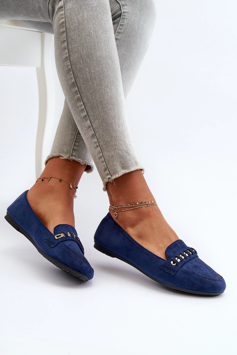 Dámské mokasíny z ekologického semiše. Ozdobené lesklým nití a páskem s řetízkem. Tento model je skvělou volbou pro každou stylovou ženu. Měkká stélka zajistí pohodlí po celý den. Tyto mokasíny budou skvělým doplňkem letního šatníku, který dodá každému outfitu jedinečný šarm a eleganci. Při výběru velikosti se řiďte tabulkou velikostí.