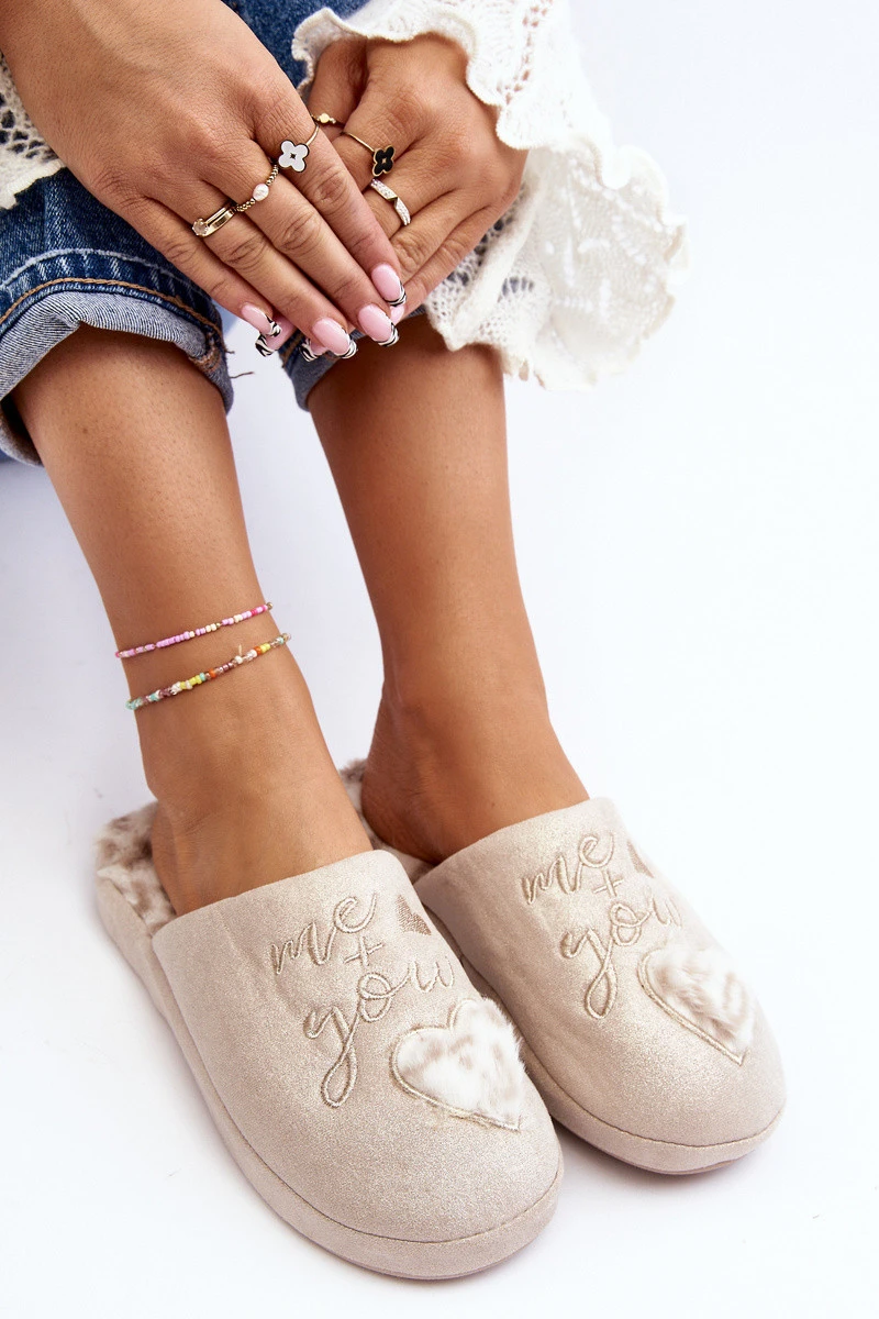 Błyszczące kapcie damskie ozdobione napisem i sercem. Model wsuwany z zakrytym noskiem. Osadzone na grubej podeszwie. Wkładka ocieplona futerkiem. Při výběru velikosti se řiďte tabulkou velikostí.