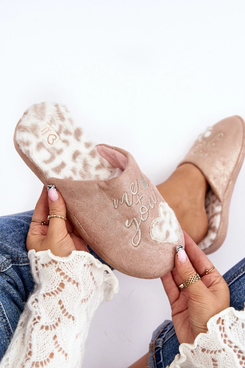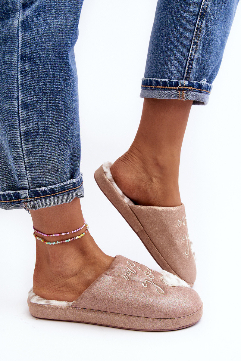 Błyszczące kapcie damskie ozdobione napisem i sercem. Model wsuwany z zakrytym noskiem. Osadzone na grubej podeszwie. Wkładka ocieplona futerkiem. Při výběru velikosti se řiďte tabulkou velikostí.