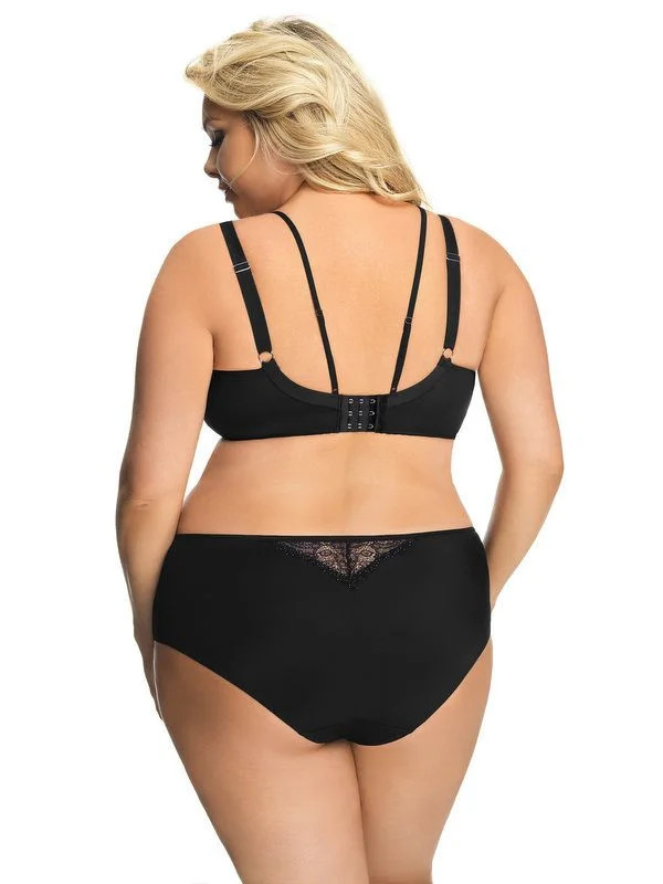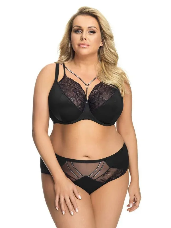 Smyslné černé kalhotky vyššího střihu z nové řady Glossy od Gorseni. Krásný, fascinující model. Přední díl s mírným projmutím a ozdobnými stříbrnými pruhy, půvabně zakončený krajkou. Zadní díl s jemnou krajkovou vsadkou v horní části. Složení: 90 % polyamid, 7 % elastan, 3 % polyester. EAN čárové kódy zboží jsou: