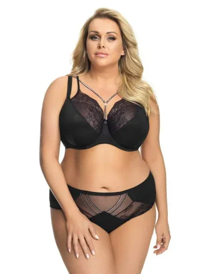 Smyslné černé kalhotky vyššího střihu z nové řady Glossy od Gorseni. Krásný, fascinující model. Přední díl s mírným projmutím a ozdobnými stříbrnými pruhy, půvabně zakončený krajkou. Zadní díl s jemnou krajkovou vsadkou v horní části. Složení: 90 % polyamid, 7 % elastan, 3 % polyester.