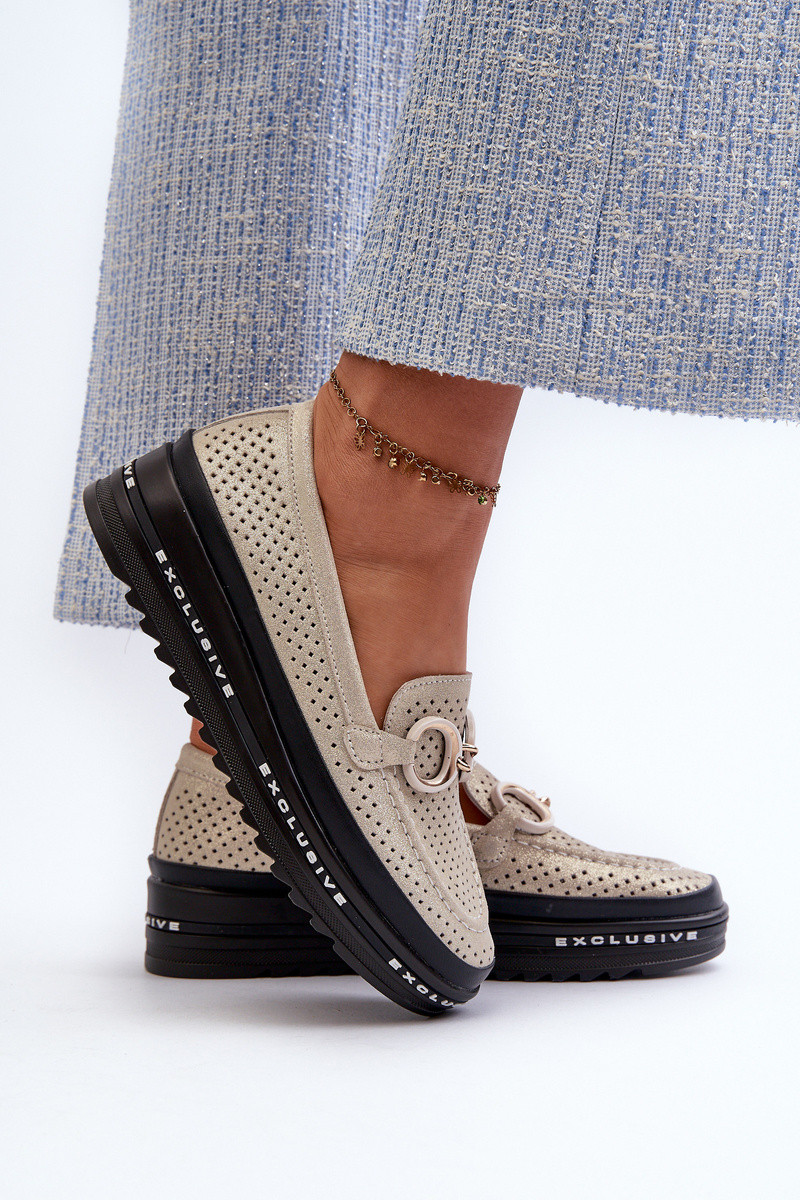 Lesklé kožené dámské mokasíny na platformě s ozdobou S.Barski LR750 zlaté
