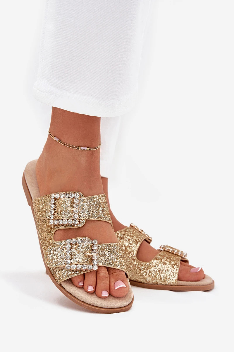 Lesklé zdobené pantofle s přezkami na plochém podpatku zlaté Tovira