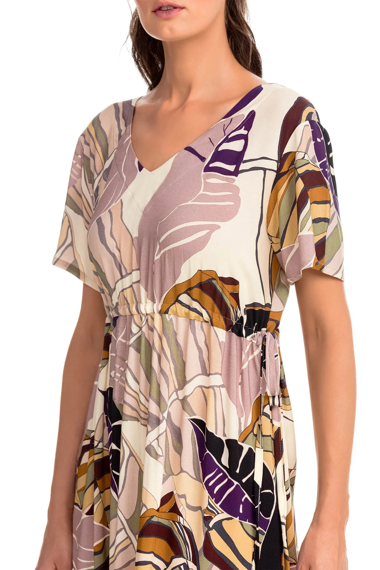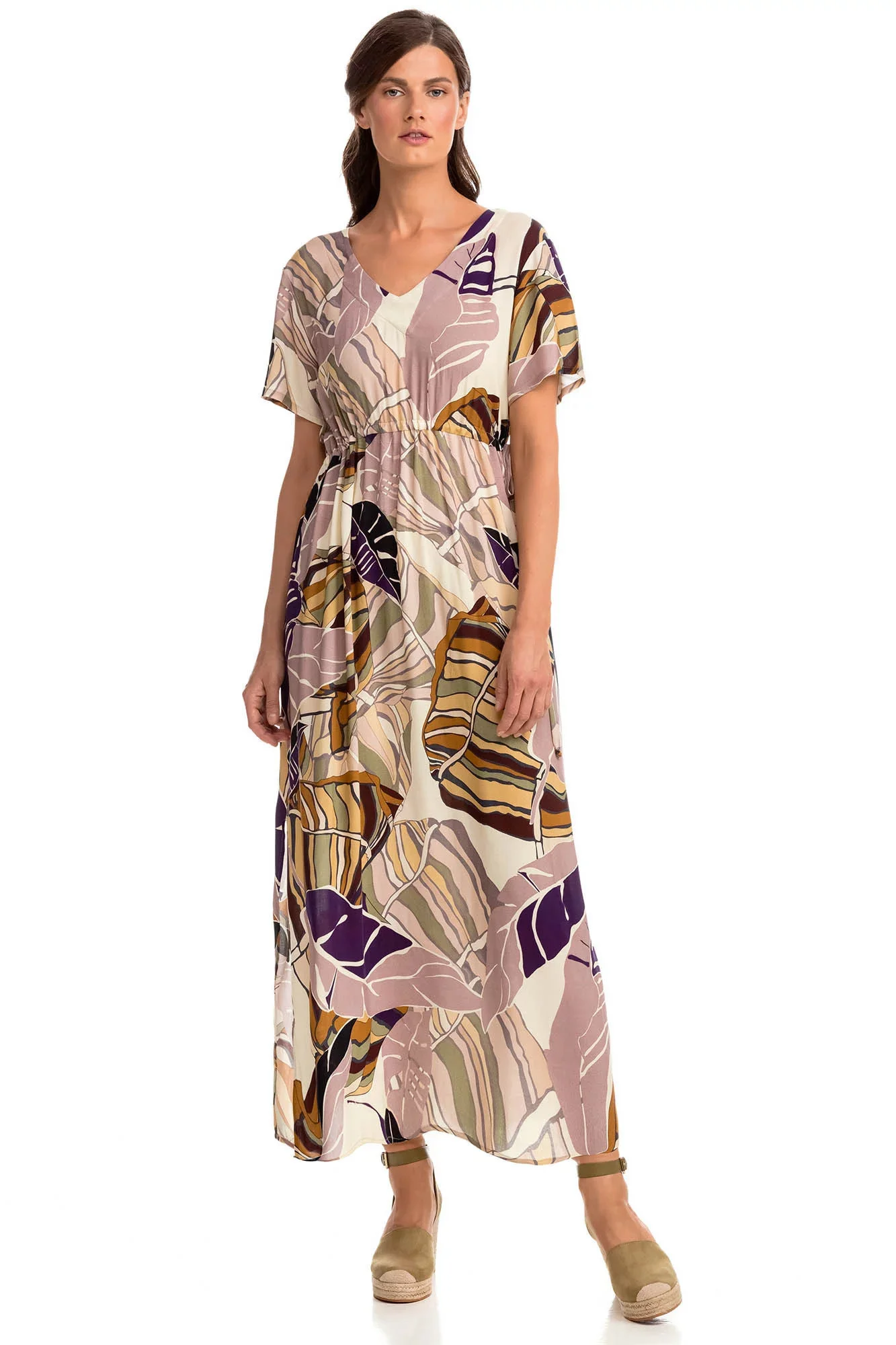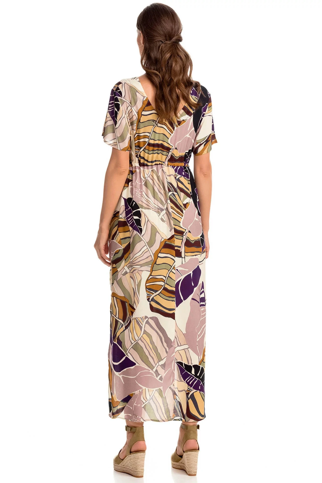 Dlouhé dámké šaty s rotlinným motivem, krátkým rukávem a výsřihem do V. Šaty jsou vyrobené z kvalitního viskózového popelínu. Popelín je odolnou, pevnou, ale zároveň měkkou a na dotek příjemnou tkaninou, která je díky viskóze příjemně chladivá a ideální pro teplé letní období.