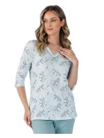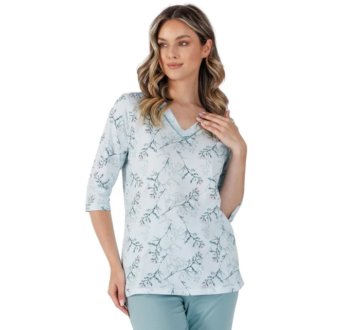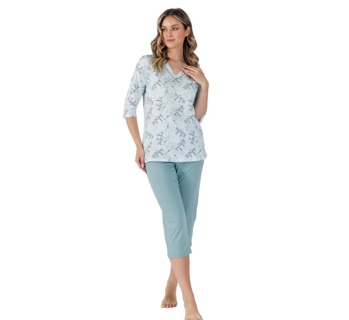 Rozhodněte se pro pohodlí a eleganci během spánku s dámským pyžamem 388J/25 ze 100% kvalitní bavlny. Košile s květinovým potiskem na knoflíky zaujme decentním stylem a pohodlím. 3/4 rukávy a praktické boční kapsy činí pyžamo funkčním a ideálním i pro domácí relaxaci. Soupravu doplňují hladké kalhoty v rybářském stylu s elastickým pasem pro volnost pohybu a pohodlí při nošení. Jedná se o vynikající volbu pro ženy, které denně oceňují přírodní materiály a elegantní design.