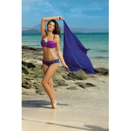 Představujeme vám plavky, které dodají vašemu vzhledu sex-appeal a půvab! Podprsenka má vyztužené košíčky, které dokonale zvedají, tvarují a podporují prsa. K velikostem S, M, L, XL jsou přidány vycpávky Push Up (lze je vyjmout), které dále opticky zvětšují poprsí.Podprsenka je zabalená do kvalitní dvoubarevné látky, takže plavky krásně ladí s vaším opálením. Uprostřed je umístěna elegantní pozlacená brož. Podprsenka má spodní a boční kostice a zapíná se na přezku. Zajímavostí jsou nastavitelné popruhy, které lze v případě potřeby odepnout.Součástí jsou jemné kalhotky, na přední straně zdobené dvoubarevným páskem a'la s ozdobnou broží. Spodní díl bikin má hladkou zadní část, není průhledný a dobře přilne k tělu.