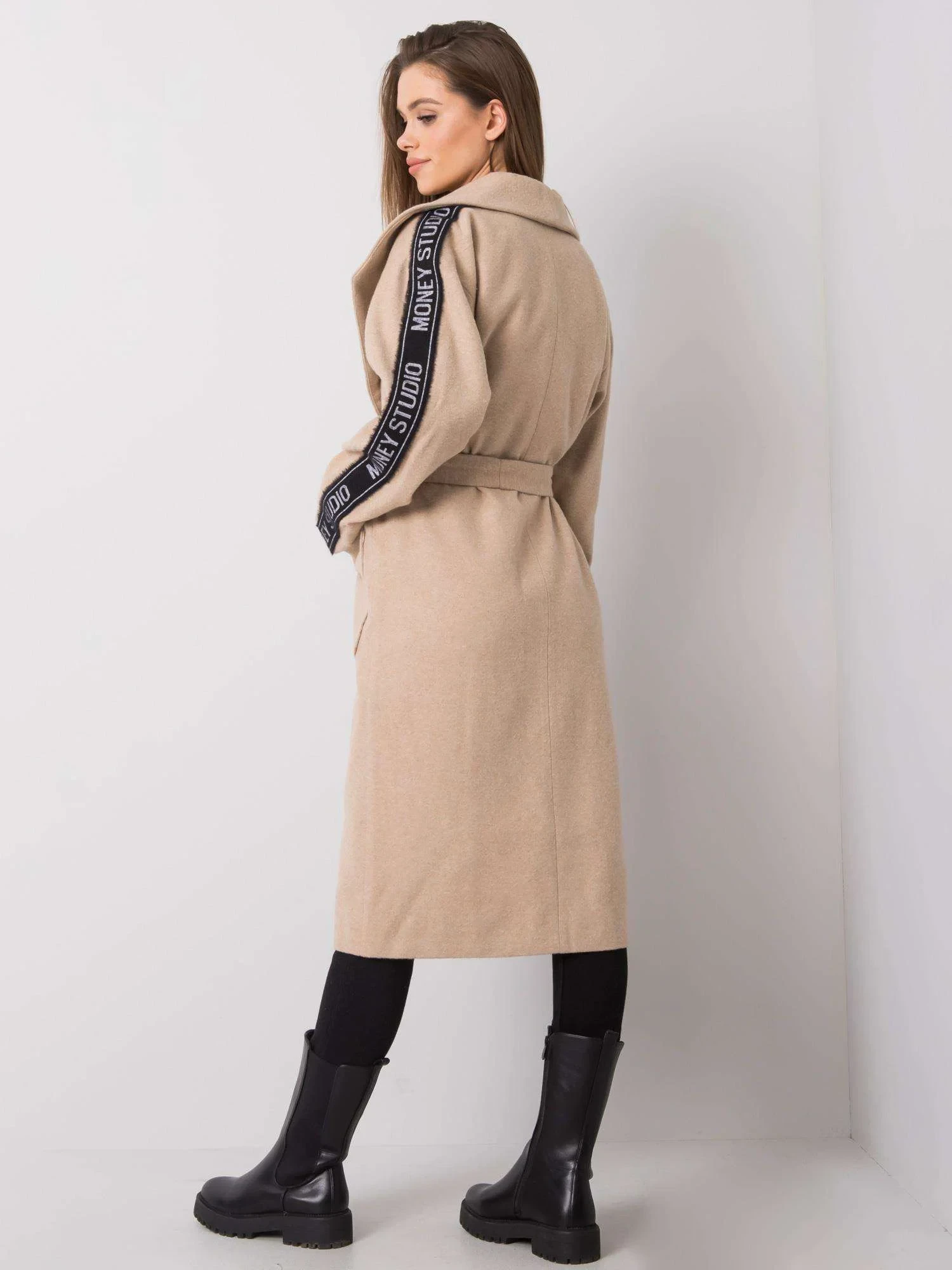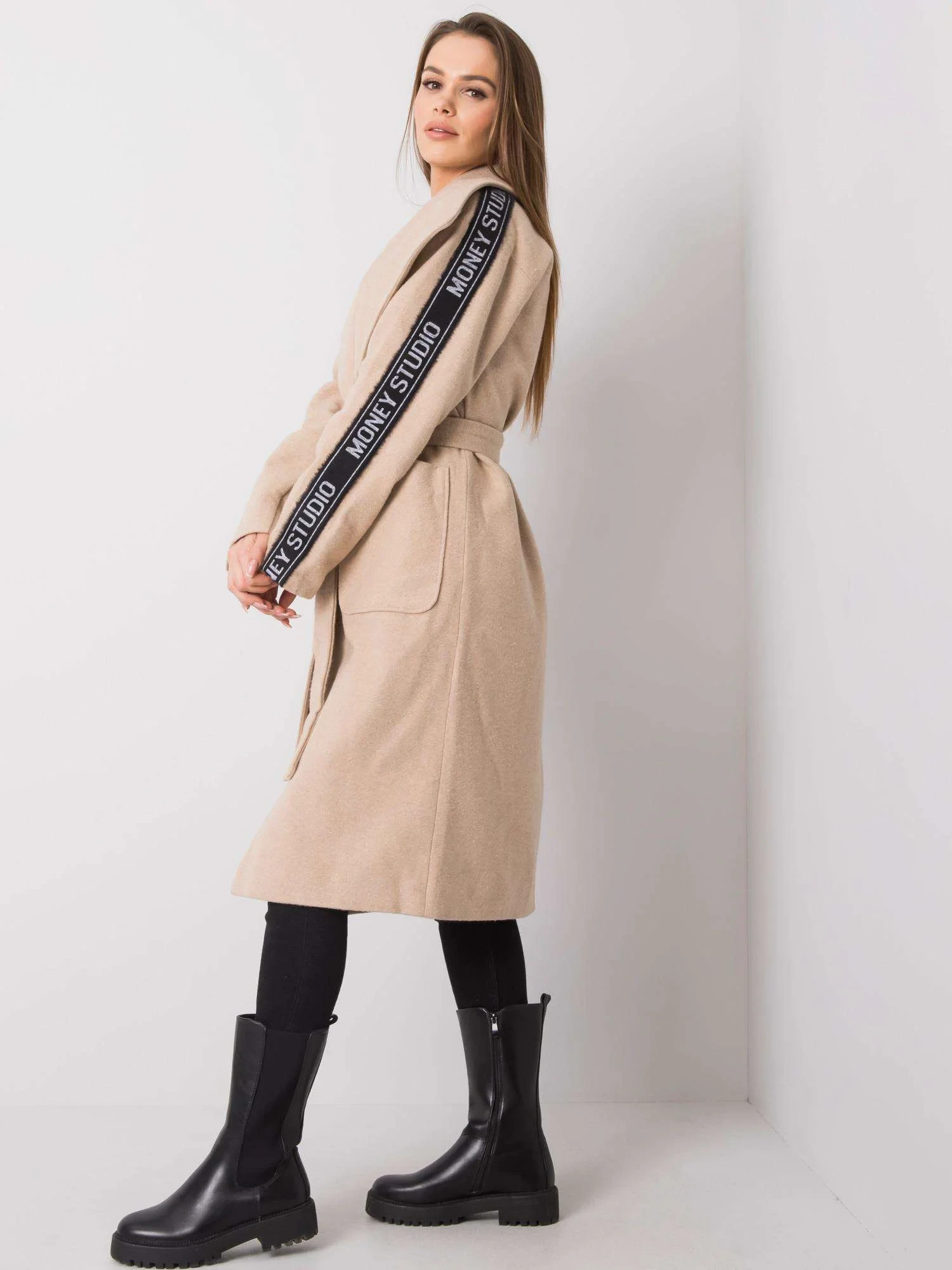Béžový dámský kabát s páskem.