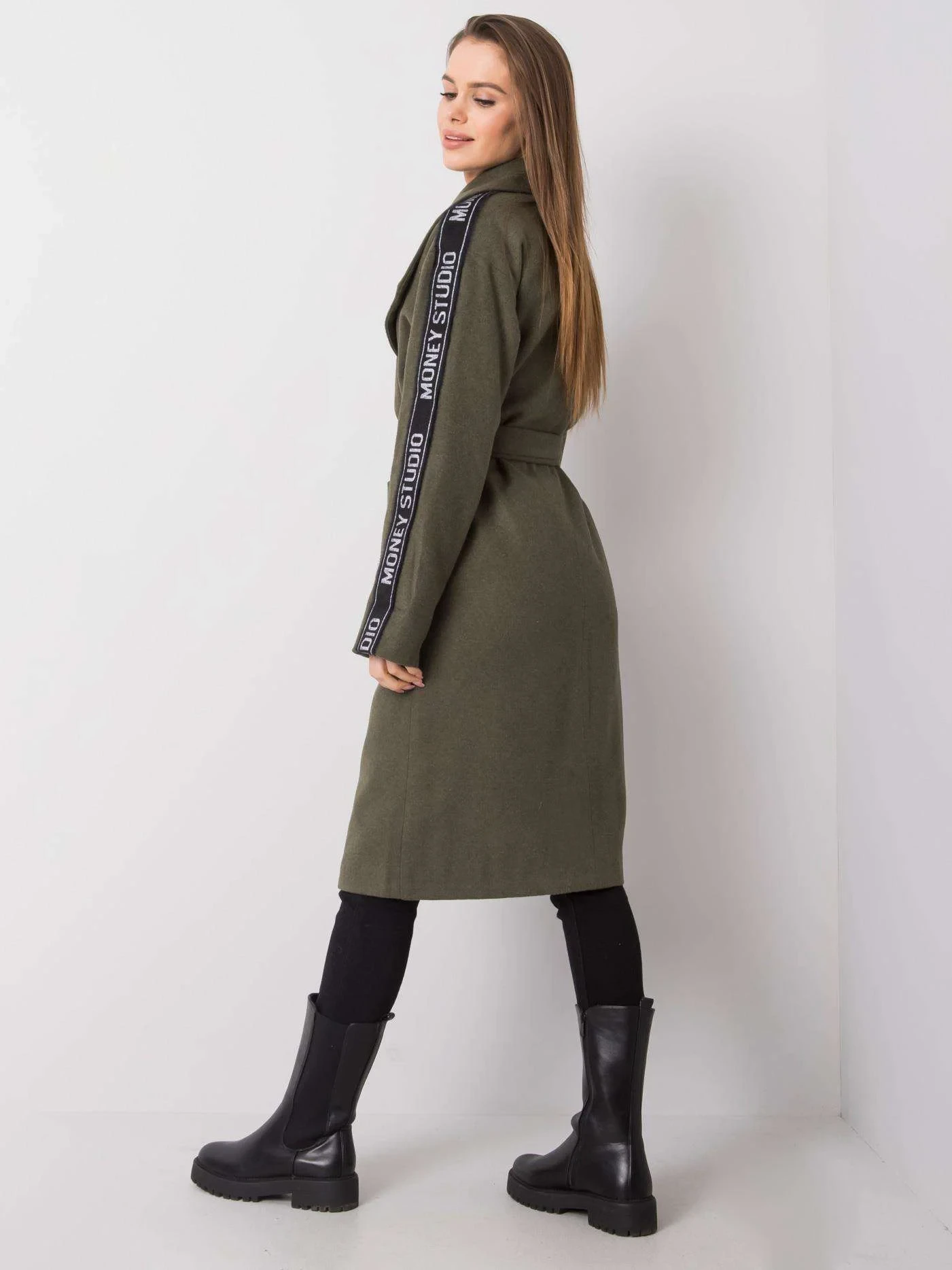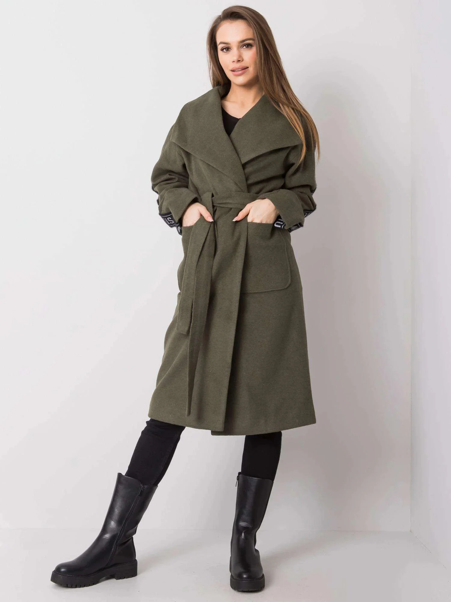 Khaki dámský kabát s páskem.