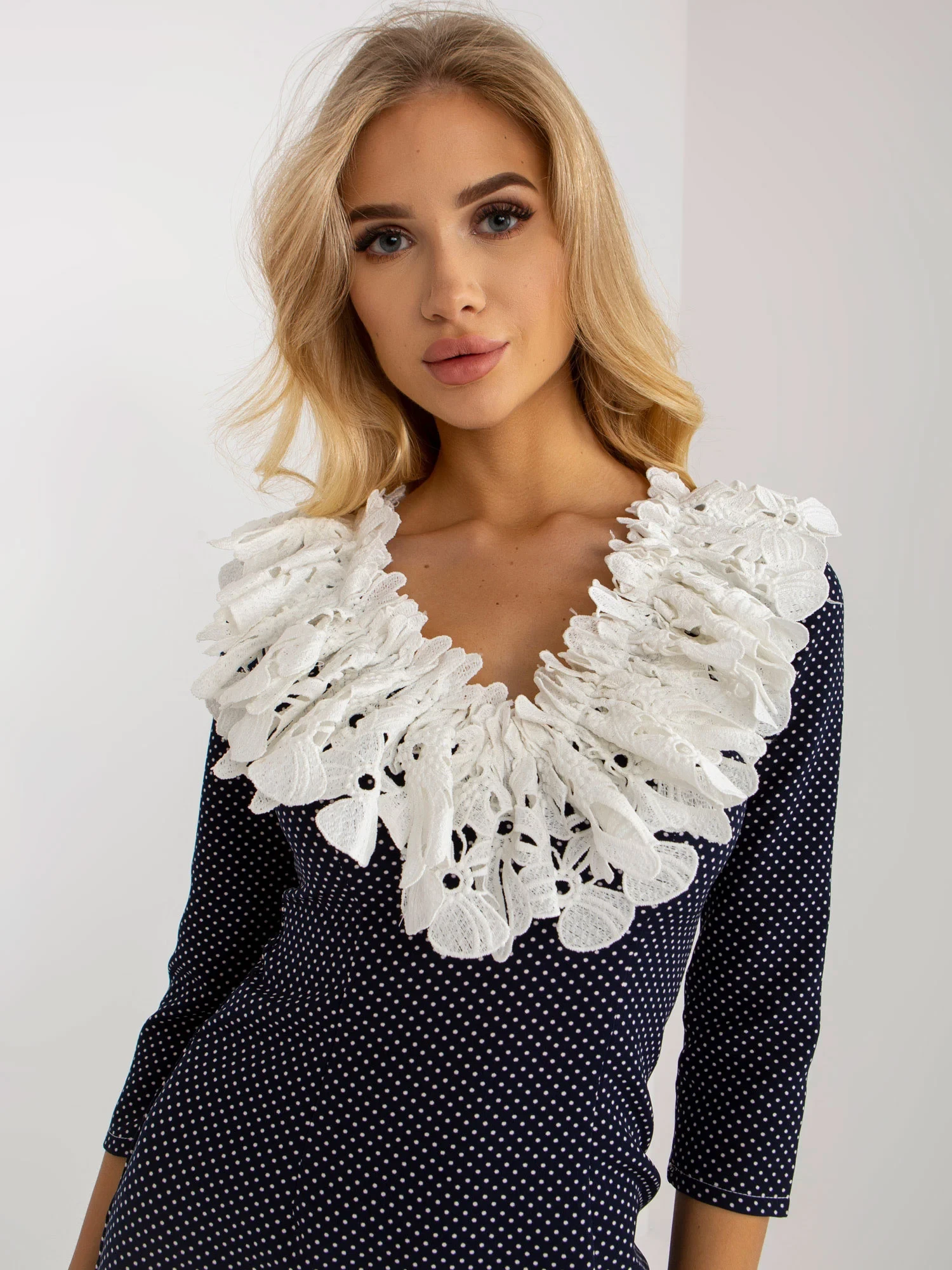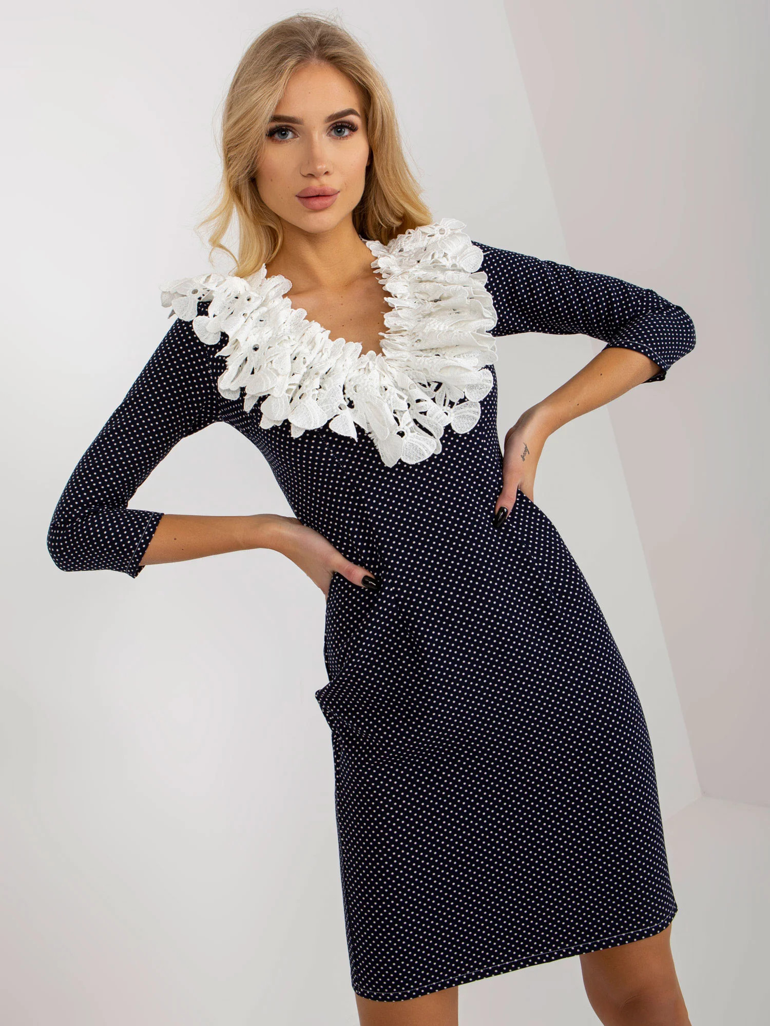 Námořnicky modré a bílé vypasované koktejlové šaty s hráškem .