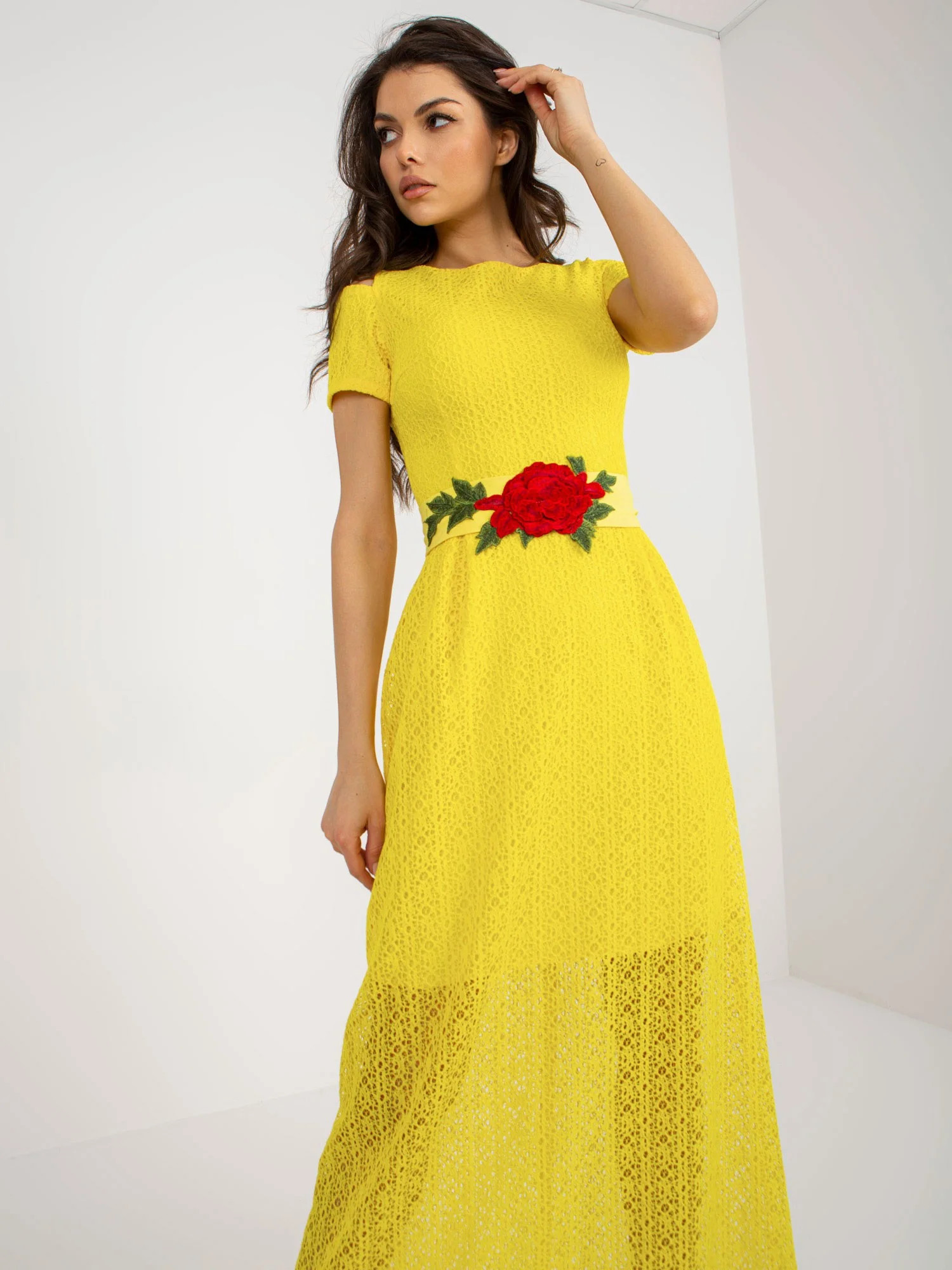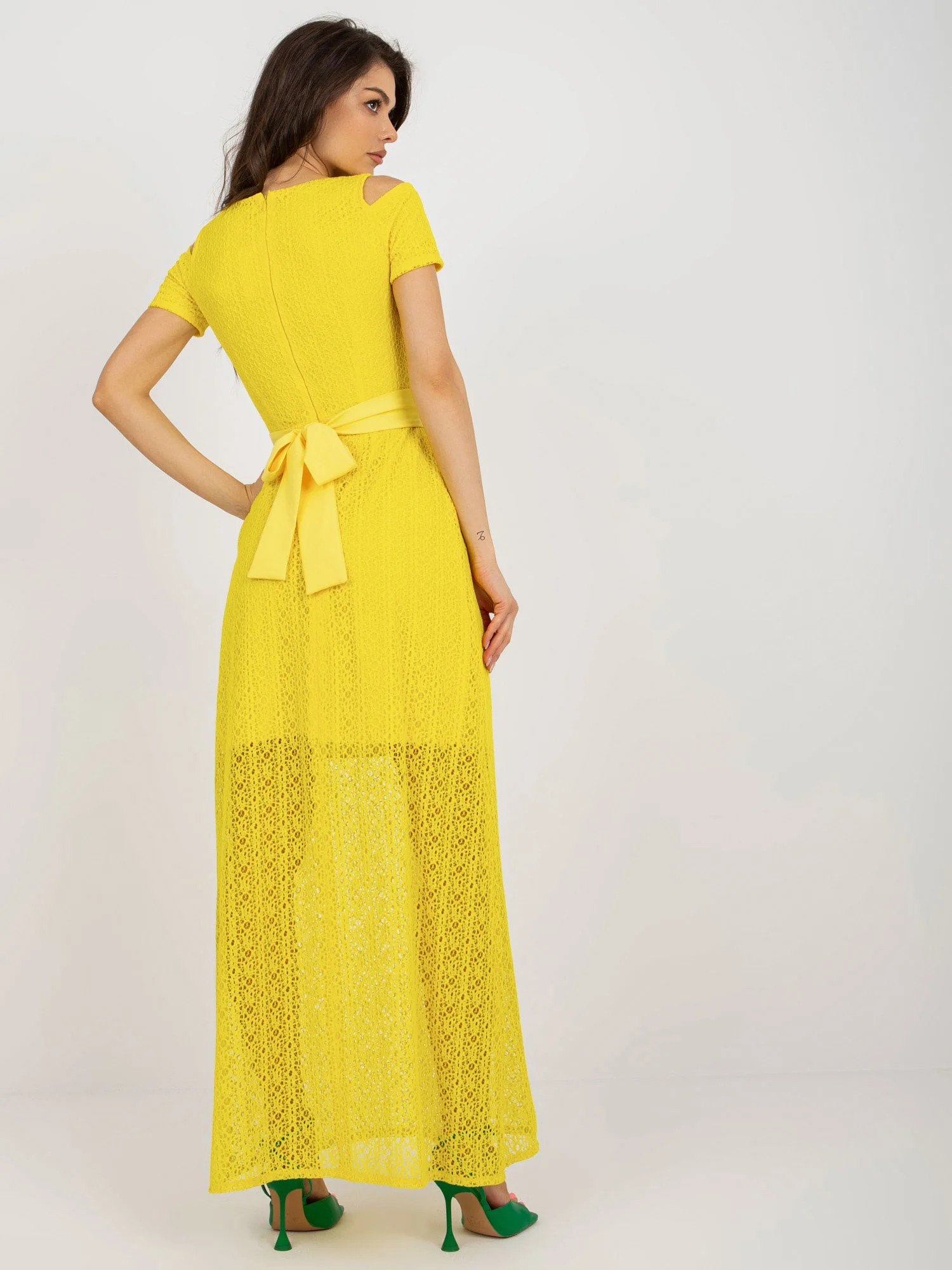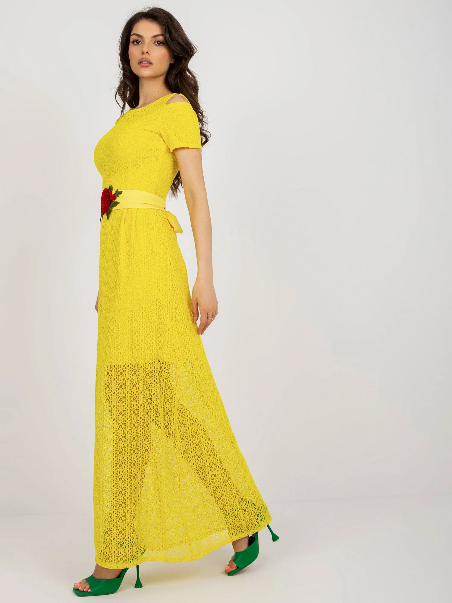 Žluté rozšířené večerní šaty s podšívkou .