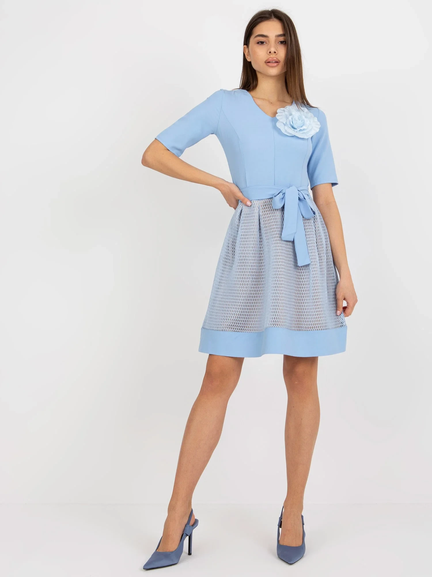 Světle modré rozšířené koktejlové šaty s páskem .