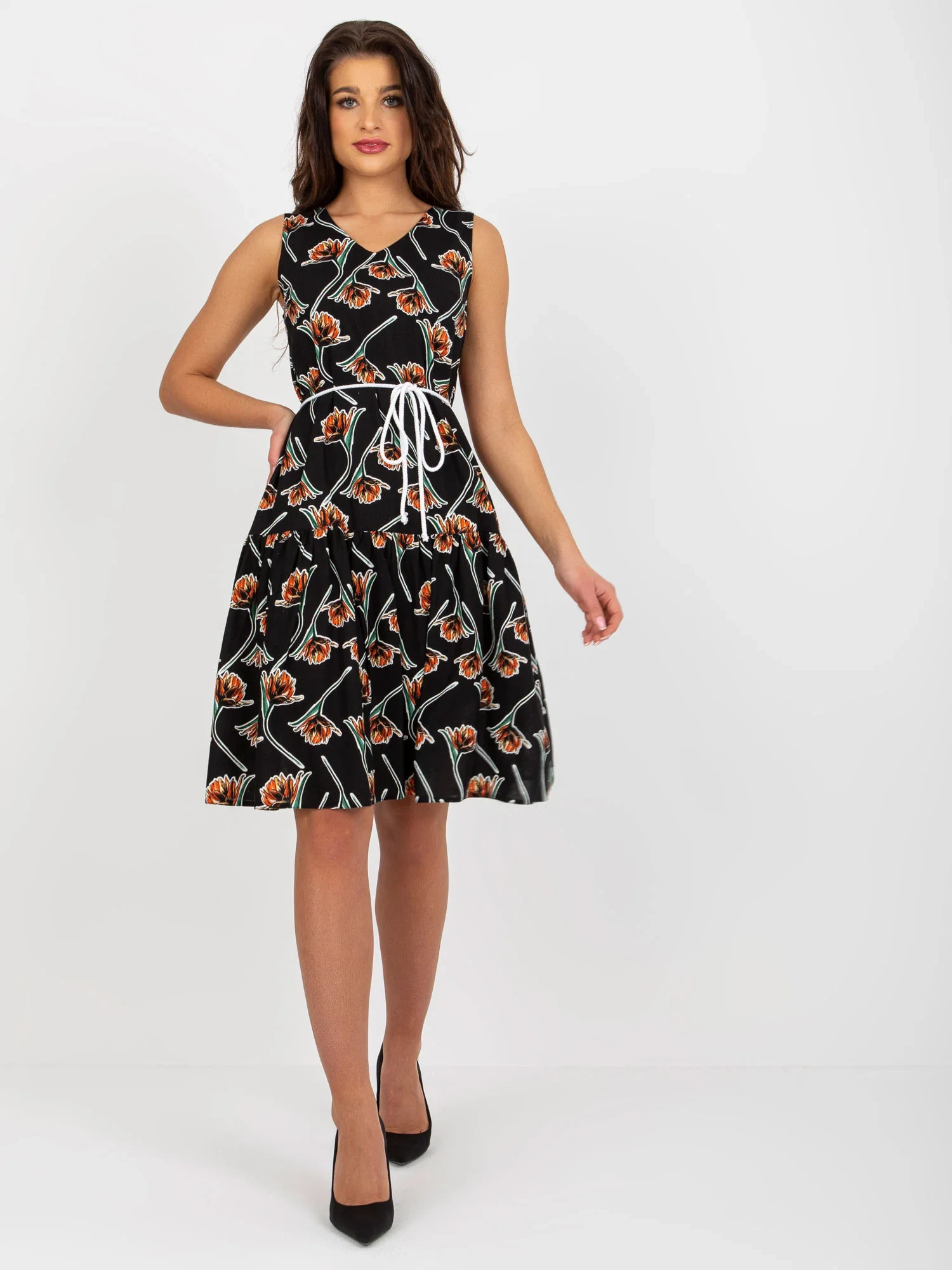 Modelka má na sobě velikost 36. Rozměry modelky: výška 173 cm, poprsí 90 cm, pas 64 cm, boky 92 cm.