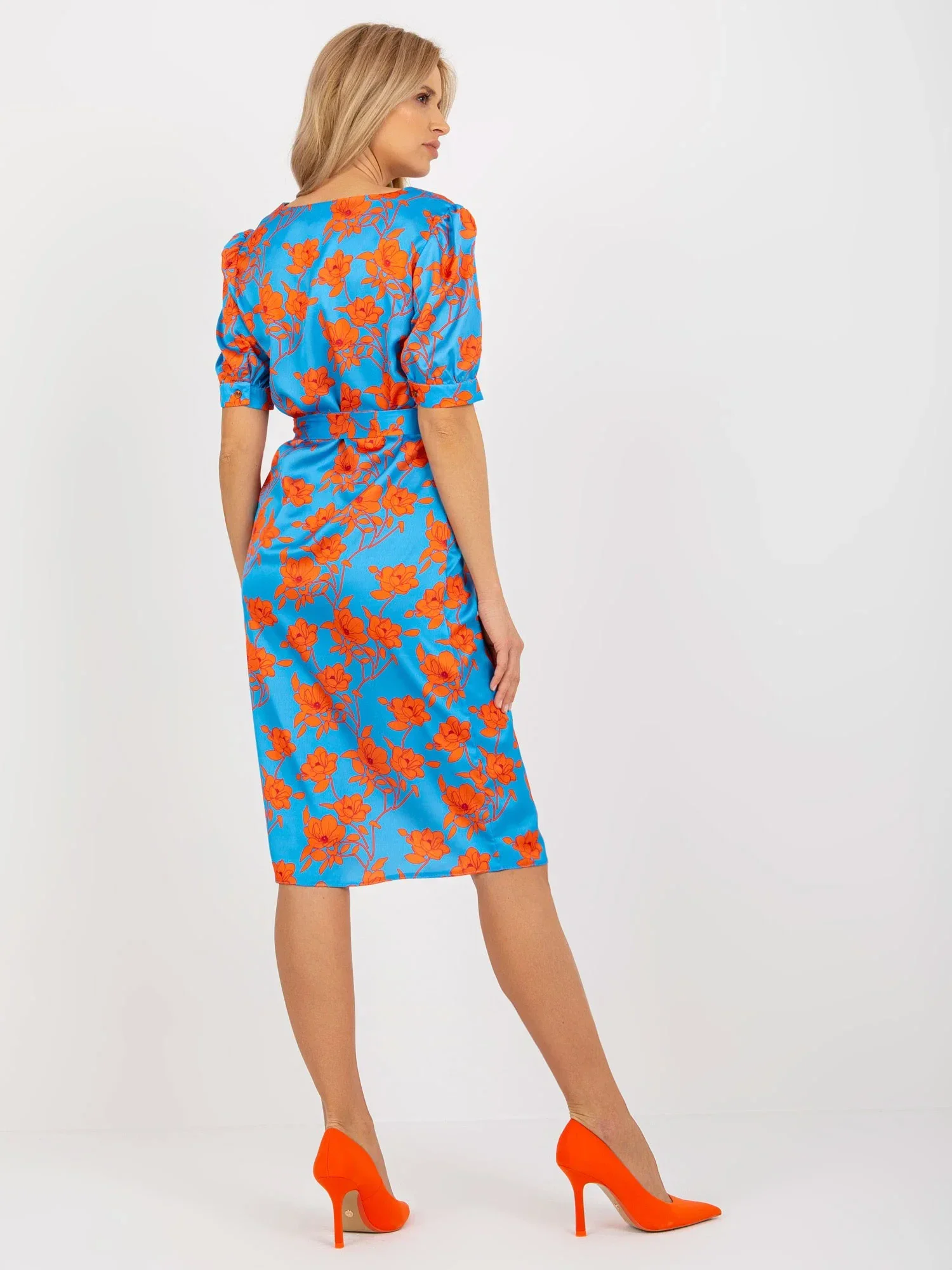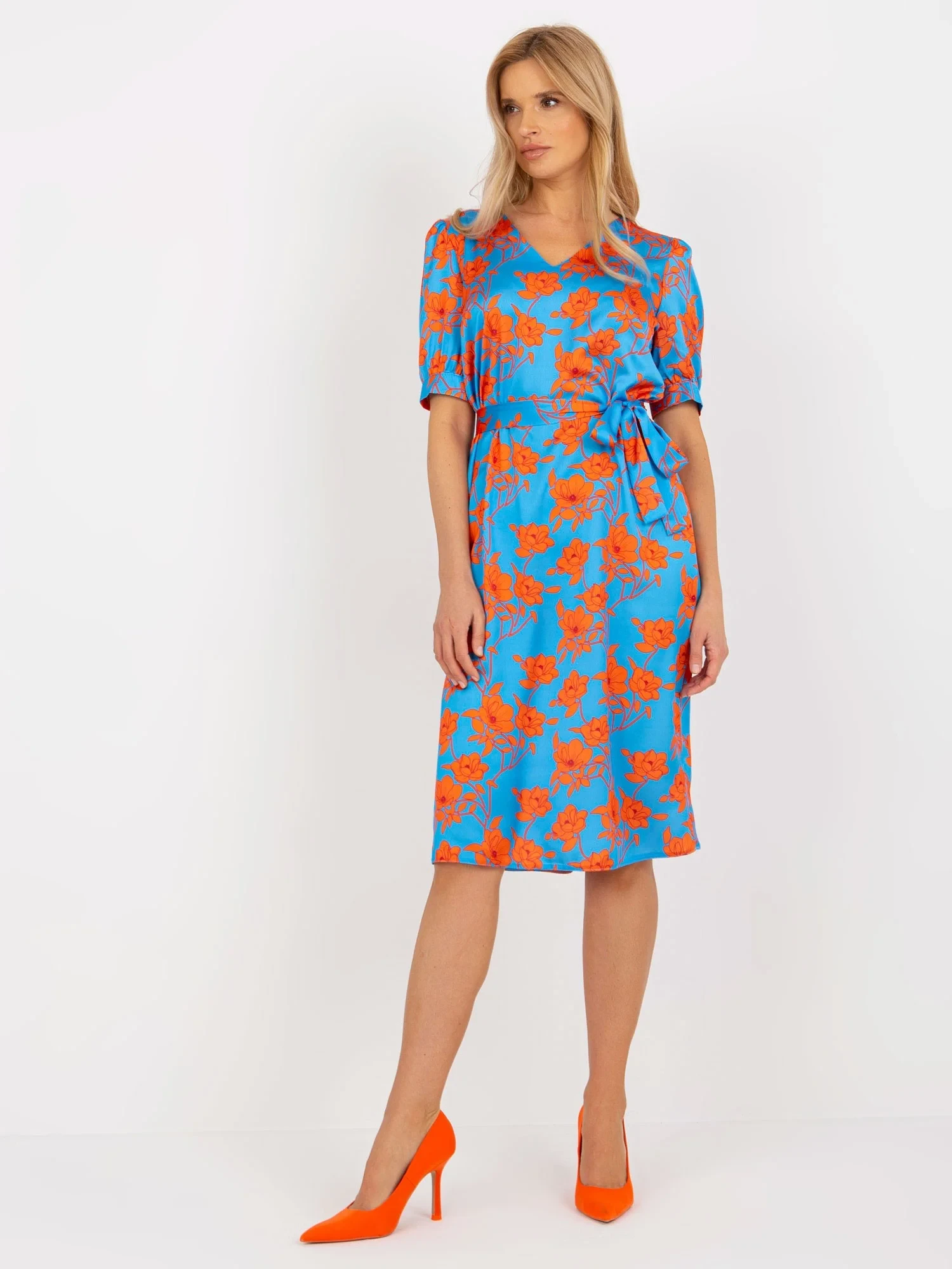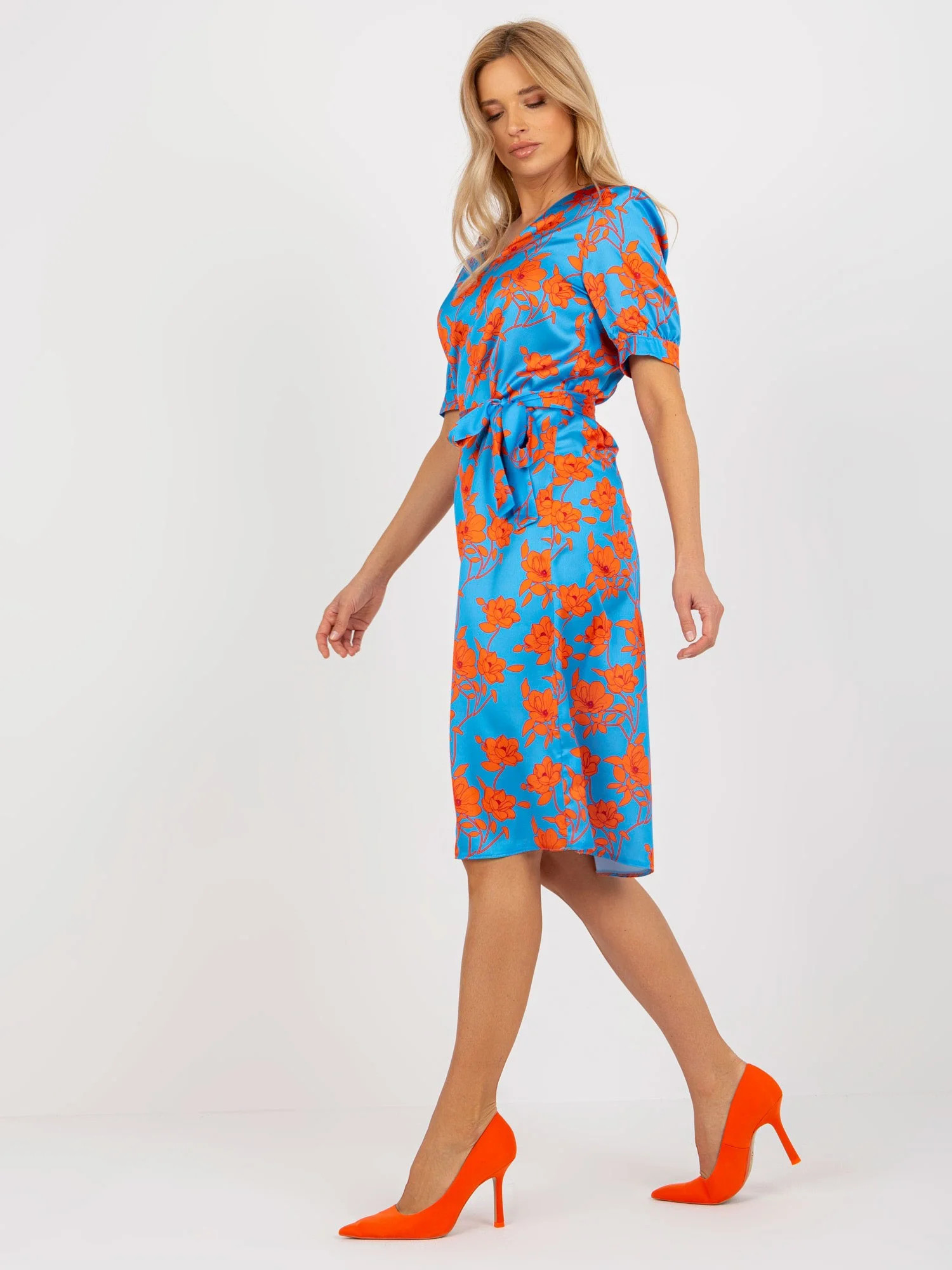 Modré a oranžové midi koktejlové šaty s vázáním .