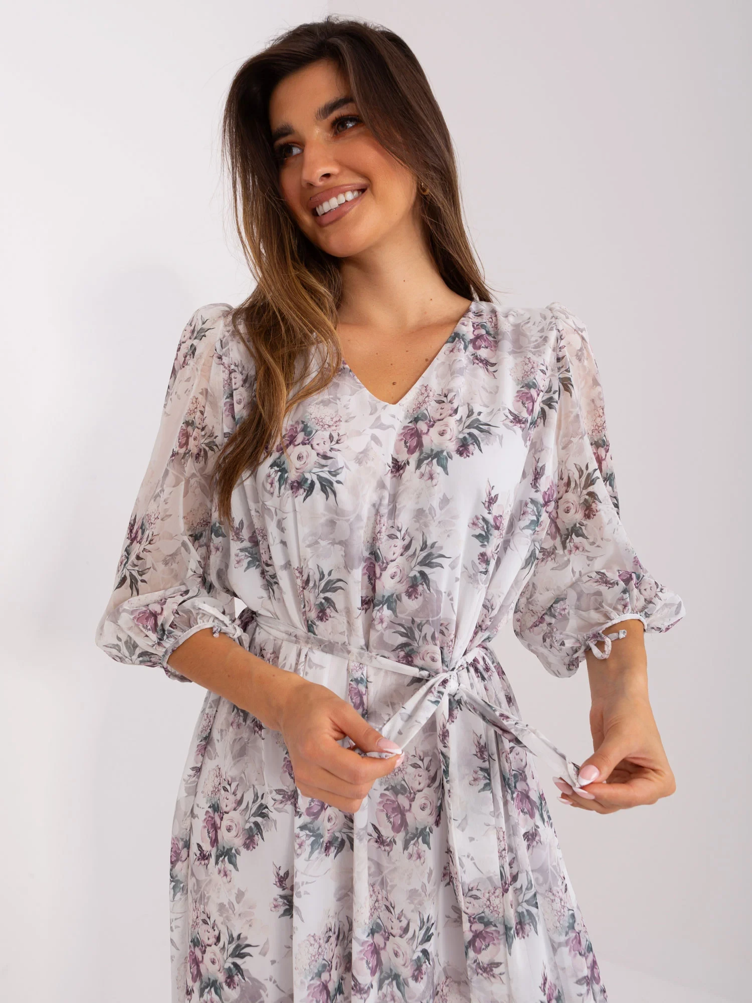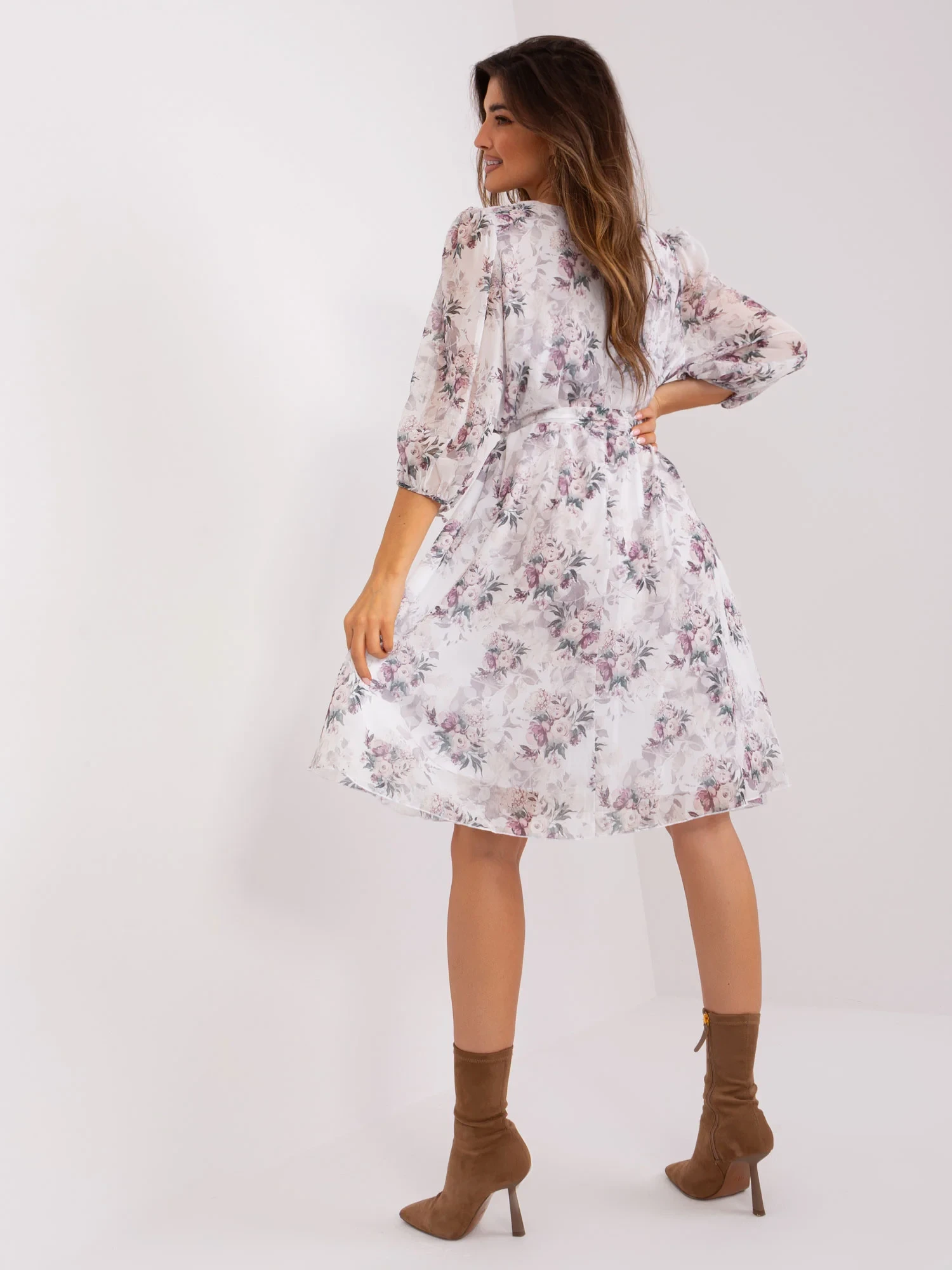 Bílé elegantní šaty s květinovým potiskem.